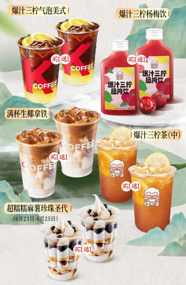 2023年6月22日-2023年6月25日期间,2023年6月21日21:59前加入的肯德基WOW会员可在“我的卡包”查看“爆汁三柠茶(中)或爆汁三柠杨梅饮买一送一”、“爆汁三柠气泡美式或满杯生椰拿铁买一送一”优惠券各1张;2023年6月23日-2023年6月25日期间,2023年6月22日21:59前加入的肯德基WOW会员可在“我的卡包”查看“超糯糯麻薯珍珠圣代买一送一”优惠券1张。活动地区:全国。“爆汁三柠茶(中)或爆汁三柠杨梅饮买一送一”、“爆汁三柠气泡美式或满杯生椰拿铁买一送一”优惠券使用有效期为2023年6月22日-2023年6月25日;“超糯糯麻薯珍珠圣代买一送一”优惠券使用有效期为2023年6月23日-2023年6月25日。凭相应优惠券到店或自助点餐或(部分优惠券适用于肯德基甜品站)或在肯德基宅急送订餐时,以菜单单品价购买指定产品(例如“爆汁三柠茶(中)或爆汁三柠杨梅饮买一送一”优惠券中的指定产品为:爆汁三柠茶(中)或爆汁三柠杨梅饮),即可得同款产品1份。爆汁三柠气泡美式自2023年5月29日起在全国上市,共限量280万杯,售完即止;爆汁三柠杨梅饮自2023年5月29日起上市,共限量400万瓶,售完即止。如遇爆汁三柠气泡美式或爆汁三柠杨梅饮售罄,根据相应券说明可替换为其他指定产品。活动仅限有此产品供应的肯德基餐厅,不适用于交通枢纽、旅游景区、西藏自治区的餐厅及精选餐厅等部分餐厅,具体情况以餐厅餐牌公示为准;活动仅限肯德基宅急送送餐范围及服务时间,部分送餐区域不供应相应产品,不同送餐区域的服务时间有差异,详情以输入送餐地址后显示的菜单及送餐时间为准。优惠券在使用有效期内每天仅限使用1次,每单仅限使用1张。券使用规则详见“我的卡包”券说明。不与其他优惠共享。产品及包装以实物为准。活动期间,每个用户每张优惠券仅限领取1次。同一ID、同一设备、同一手机号、同一支付账户、同一取餐联系电话、同一送餐联系电话、同一送餐地址,均视为同一用户。对于任何通过不正当手段(包括但不限于作弊、通过机器行为等方式恶意刷单)参加活动获取权益或者不符合活动规则的行为,我们将在不事先通知的前提下取消该用户参与活动的资格和已获得的相应权益。不同餐厅的价格不同,具体以各餐厅餐牌公示的实际价格为准。