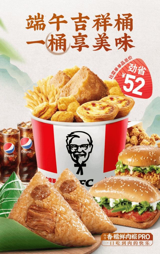 套餐中的指定饮品可补差价替换为其他饮料;套餐中的吮指原味鸡可补差价替换为黄金脆皮鸡;套餐中的新奥尔良烤鸡腿堡可加2元替换为汁汁双层嫩牛堡(经典美式风味)1个。端午吉祥桶自2023年6月12日-2023年6月25日上市,香糯鲜肉粽PRO自2023年5月26日起上市,共限量188万个,售完即止。如遇套餐中的香糯鲜肉粽PRO售罄,则香糯鲜肉粽PRO 2只将替换为香辣鸡翅(2块)1份+葡式蛋挞(经典)1只。活动渠道:堂食-柜台点餐/堂食-自助点餐机/自助点餐-到店自取。活动时间:堂食9:30-23:00。活动地区:全国。堂食具体供应时间以餐厅实际营业时间为准,仅限有此产品供应的肯德基餐厅,交通枢纽、旅游景区、西藏自治区的餐厅及精选餐厅等部分餐厅不供应此产品,具体情况以餐厅餐牌公示为准。除推广产品外,其他物品仅做装饰目的,图示内容仅供参考。产品、周边、玩具及包装以实物为准。不与其他优惠共享。堂食、肯德基宅急送自有渠道、第三方外卖平台外送渠道、甜品站、团购渠道、企业送渠道及其他渠道的产品组合、价格及优惠活动,以各渠道页面公示为准。