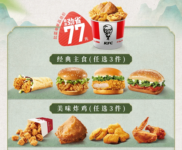 活动自2023年5月26日-2023年6月25日。活动期间,肯德基WOW会员可获领指定电子优惠券1张,请前往肯德基超级APP会员卡包查看并使用。香糯鲜肉粽PRO自2023年5月26日起上市,全国售卖数量为188万个,售完即止。活动地区:全国。电子优惠券具体使用规则详见“我的卡包”券说明。同一会员就本活动电子优惠券仅限领取1次。每单仅限使用1张电子优惠券。电子优惠券在活动期间可多次使用。同一ID、同一设备、同一手机号、同一支付账户、同一取餐联系电话、同一送餐联系电话、同一送餐地址,均视为同一用户。对于任何通过不正当手段(包括但不限于作弊、通过机器行为等方式恶意刷单)参加活动获取权益或者不符合活动规则的行为,我们将在不事先通知的前提下取消该用户参与活动的资格和已获得的相应权益。堂食具体供应时间以餐厅实际营业时间为准,仅限有此产品供应的肯德基餐厅,交通枢纽、旅游景区、西藏自治区的餐厅及精选餐厅等部分餐厅不供应此产品,具体情况以餐厅餐牌公示为准;外送部分送餐区域不供应此产品,详情以输入地址后显示的菜单及送餐时间为准。除推广产品外,其他物品仅做装饰目的,图示内容仅供参考。产品、周边、玩具及包装以实物为准。不与其他优惠共享。堂食、肯德基宅急送自有渠道、第三方外卖平台外送渠道、甜品站、团购渠道、企业送渠道及其他渠道的产品组合、价格及优惠活动,以各渠道页面公示为准。*最高劲省是指:在选择单品价最高的产品【新奥尔良烤鸡腿堡*3个+新奥尔良烤翅*3份+香糯鲜肉粽PRO*4只+爆汁三柠茶(中)*3杯】组成套餐时,套餐价相较于产品菜单单品总价最多可省的金额。活动自2023年6月22日-2023年6月25日。活动期间,可以指定金额在指定品类中任选指定数量的指定产品,详情以菜单显示为准。香糯鲜肉粽PRO自2023年5月26日起上市,共限量188万个,售完即止。活动渠道:堂食-柜台点餐/堂食-自助点餐机/自助点餐-到店自取。活动时间:堂食9:30-23:00。活动地区:全国。堂食具体供应时间以餐厅实际营业时间为准,仅限有此产品供应的肯德基餐厅,交通枢纽、旅游景区、西藏自治区的餐厅及精选餐厅等部分餐厅不供应此产品,具体情况以餐厅餐牌公示为准。除推广产品外,其他物品仅做装饰目的,图示内容仅供参考。产品、周边、玩具及包装以实物为准。不与其他优惠共享。堂食、肯德基宅急送自有渠道、第三方外卖平台外送渠道、甜品站、团购渠道、企业送渠道及其他渠道的产品组合、价格及优惠活动,以各渠道页面公示为准。