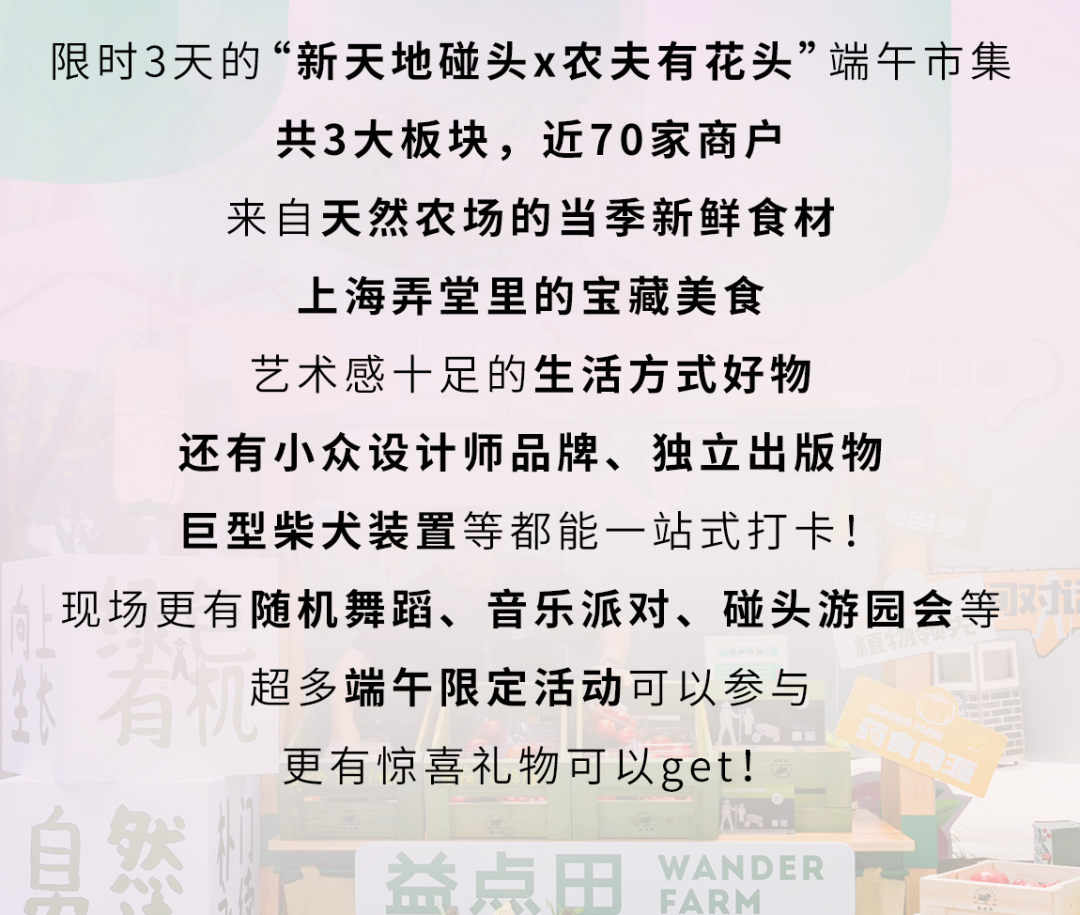 作为上海新天地社群栏目“碰头”,联合FOODIE SOCIAL旗下全新品牌“农夫有花头”首次开启的灵感端午市集,本次联动堪称精彩绝伦。