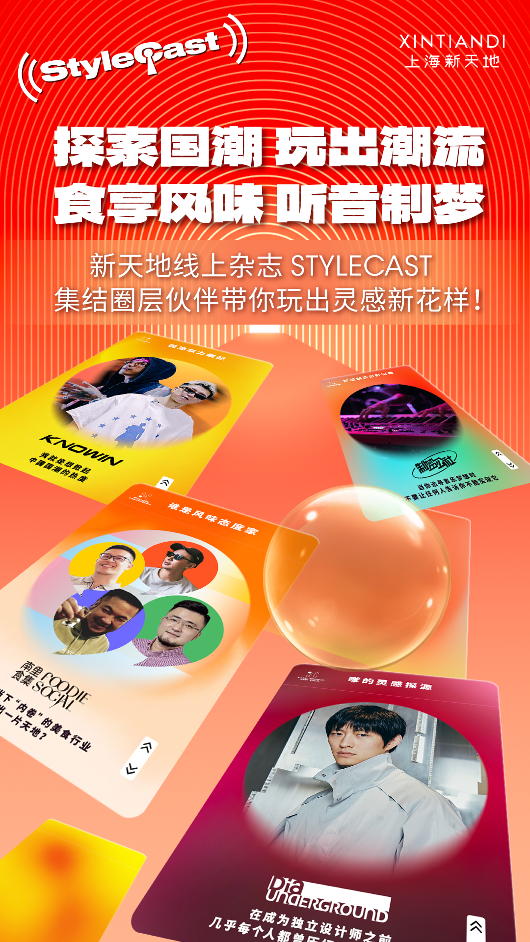 除了超好玩的碰头市集之外,新天地还开设了很酷的文化交流空间STYLECAST,让大家不止能在线下相聚,在线上也能碰一碰!STYLECAST会定期推出不同栏目和主题,本期分享和探讨音乐、美食、国潮、设计等不同潮流文化。快来一起看看本期精彩~