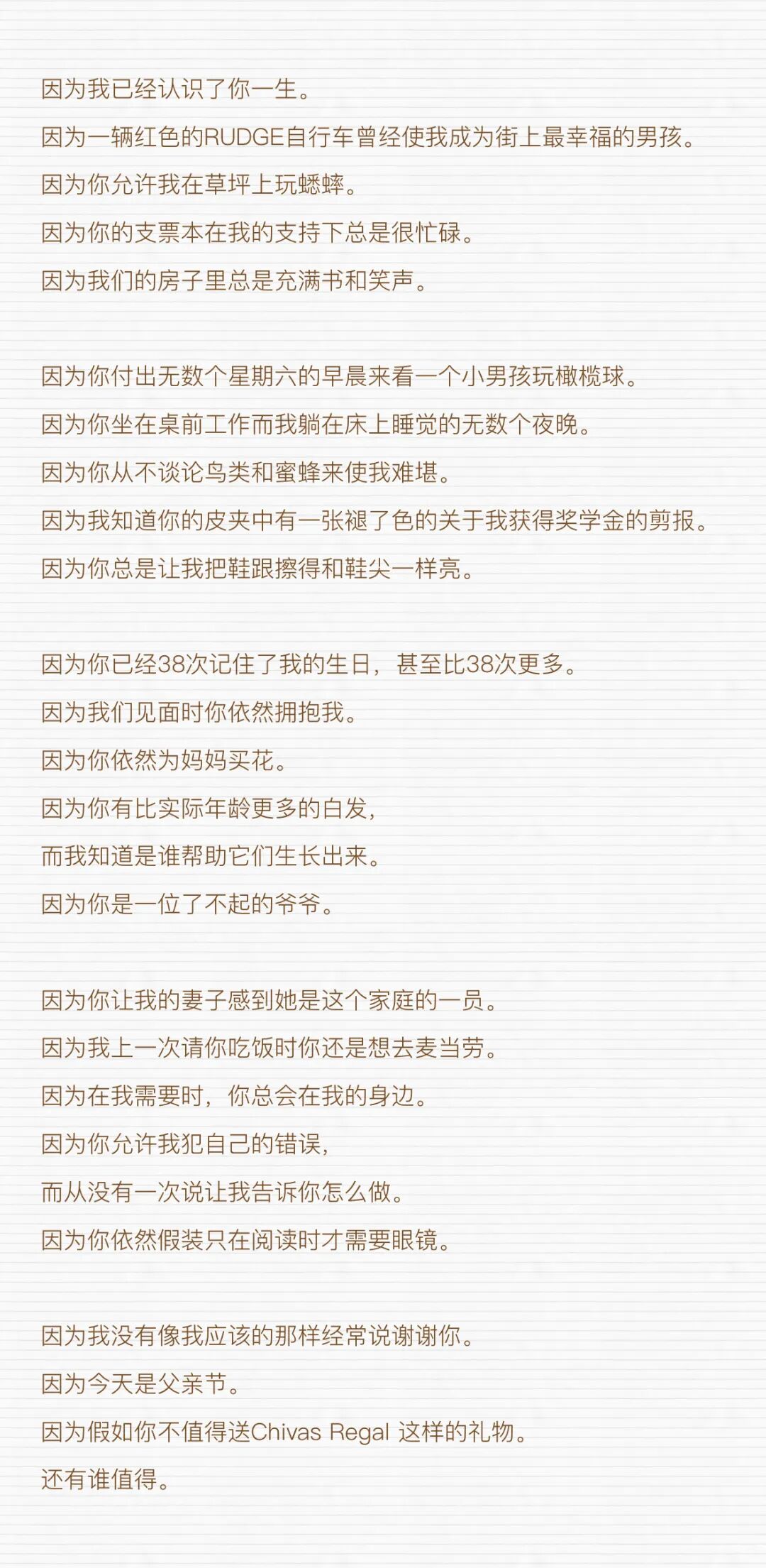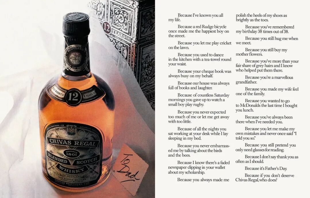 如你在上面这支视频中所见,这个有冲突感的父亲节礼物,美团外卖选择的是在父亲节给爸爸们送一束花。一是因为「花」作为美团外卖上的一个大众品类,它能够承接得住用户的下单需求。二是对爸爸这个群体来说,他们很熟悉花,一生中也可能会送出过很多束花,但自己却很少能收到一束花。就像那个扎心的、不是笑话的笑话所描述的那样:大部分男人收到的第一束花,往往都是自己走到人生终点的时候。确立了这个礼物之后,对美团外卖和胜加来说,剩下最主要的工作就是要说服大家接受:为什么在父亲节要送爸爸一束花?毕竟和母亲节送花不太一样,父亲节送花这件事,在用户心目当中并没有太多的先天心理基础。从最终的解决方案来看,美团外卖是筛选出了 25 个给爸爸送花的理由。而这个文案的叙事结构,也容易让人想起广告史上,早年间撰稿人大卫·阿伯特David Abbott 为芝华士Chivas Regal 在父亲节创作的经典文案:
