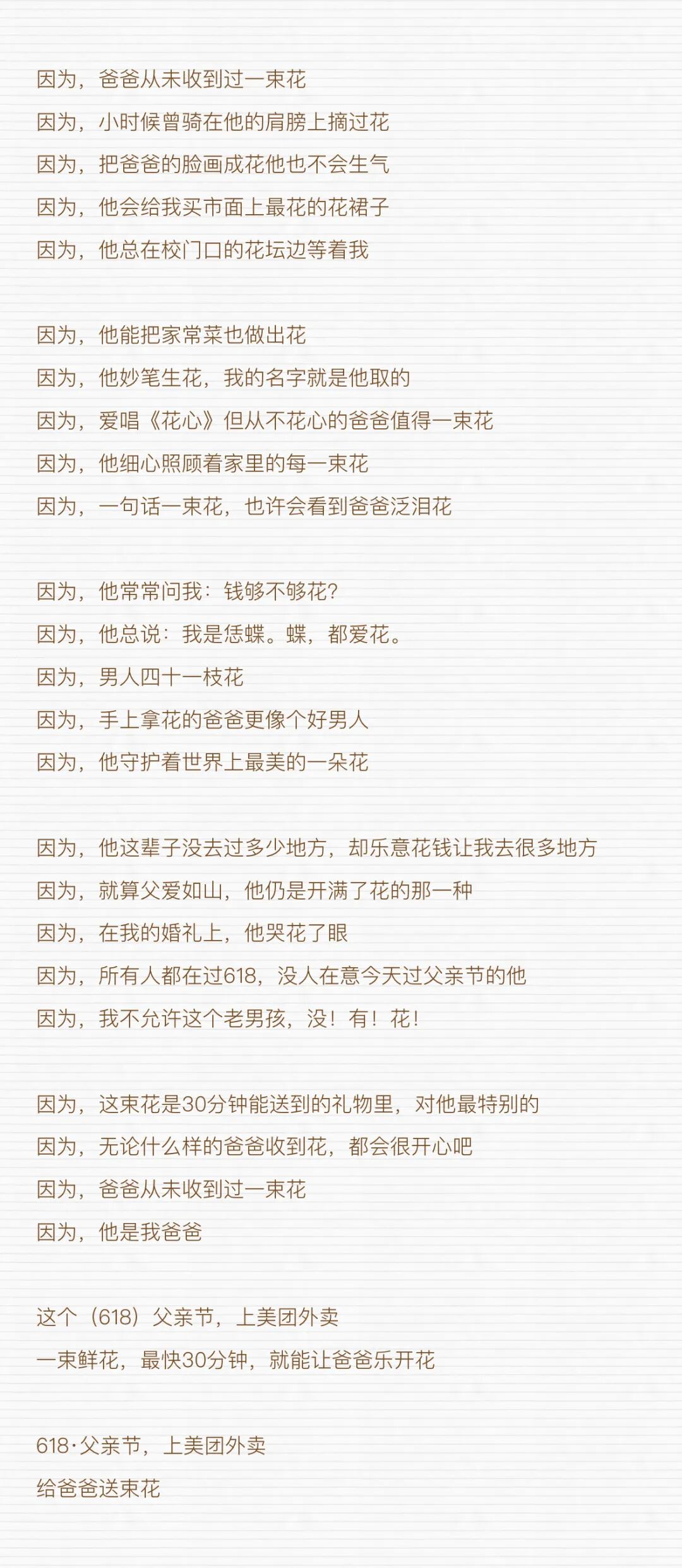 把这两个品牌的文案放在一起比较,它不同的地方在于:芝华士的文案更侧重于站在一个同样已经身为父亲角色的儿子角度,娓娓道来了父亲在他自己生命和家庭里所留下的美好回忆与言传身教。美团外卖的文案则更侧重于寻找并建立起「父亲和花」,这两者之间的强关系。因为回头去看你就会发现,它几乎在每一句文案里,都出现了「父亲」的身影和「花」的字眼。就像 2022 年美团外卖在母亲节期间推出的「妈妈爱花,我们爱她」里所采取的创作路径一样,当时它也在建立起「母亲和花」之间的强关系。