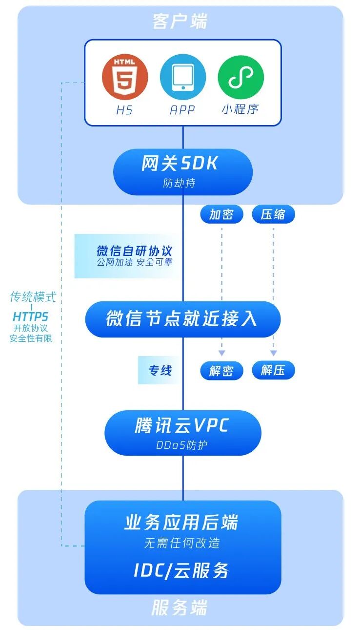 业务数据得以在微信构建的安全通讯通道中封闭传输,让黑客难以通过“肉鸡”模拟请求,解决业务公网通讯全链路的通讯安全问题。