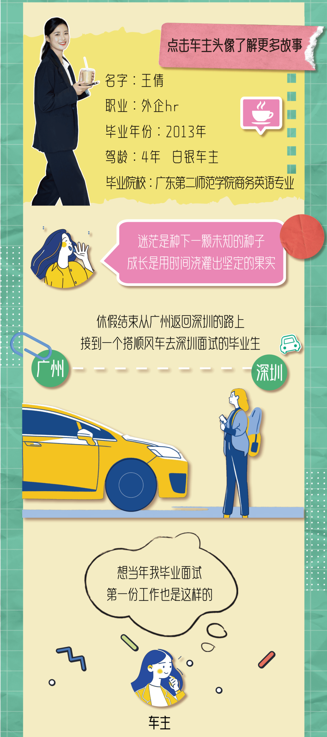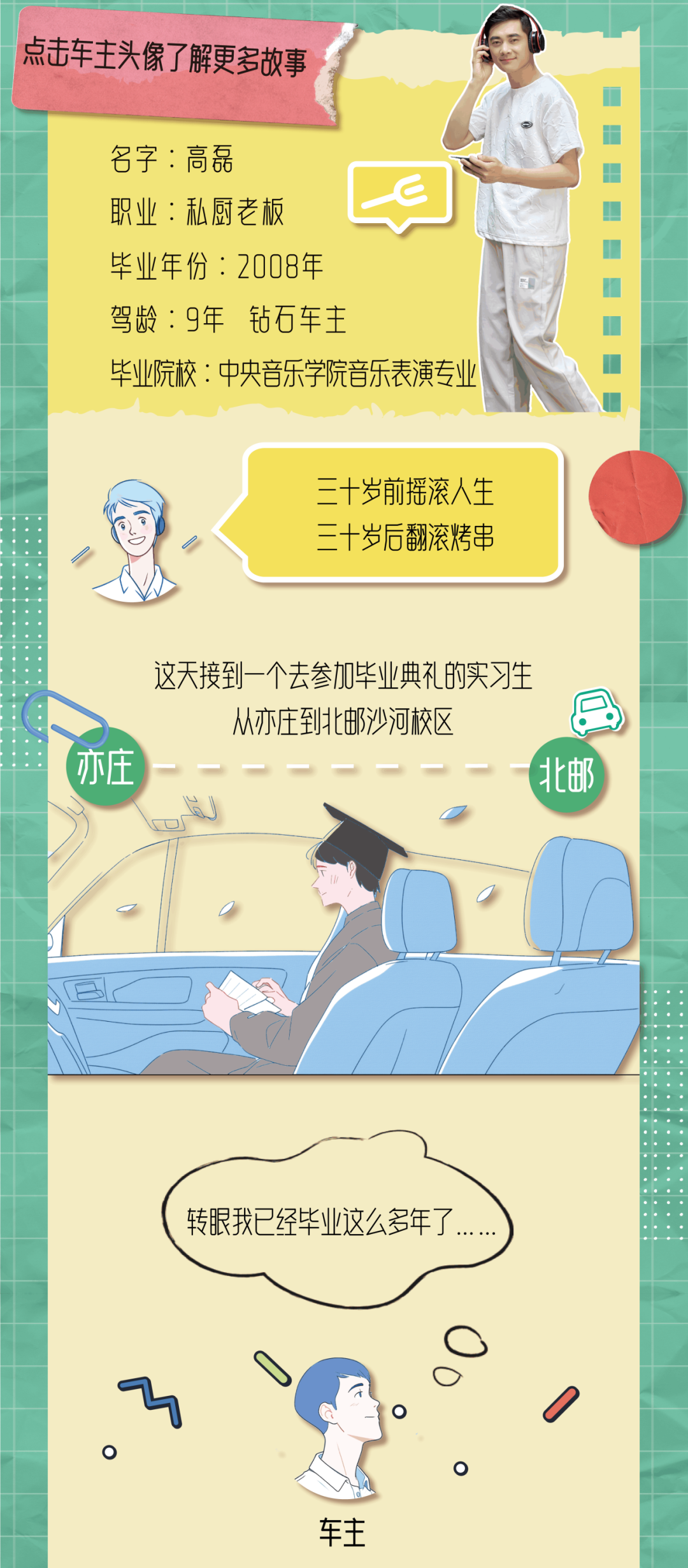 推荐:毕业季,「点击伸缩式展开」毕业车车主的故事,「点击切换」查看毕业生和车主之间的对比,吸引大家互动选出自己喜欢的车主故事。