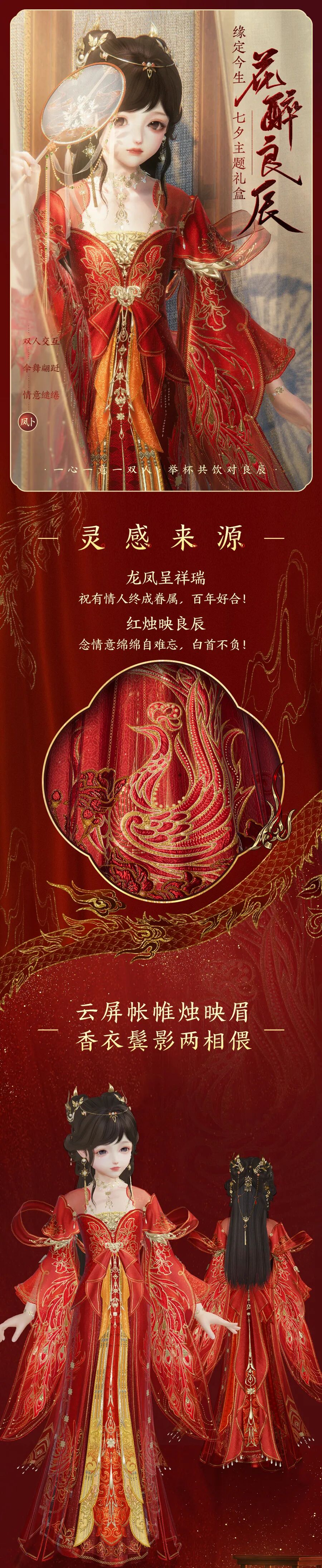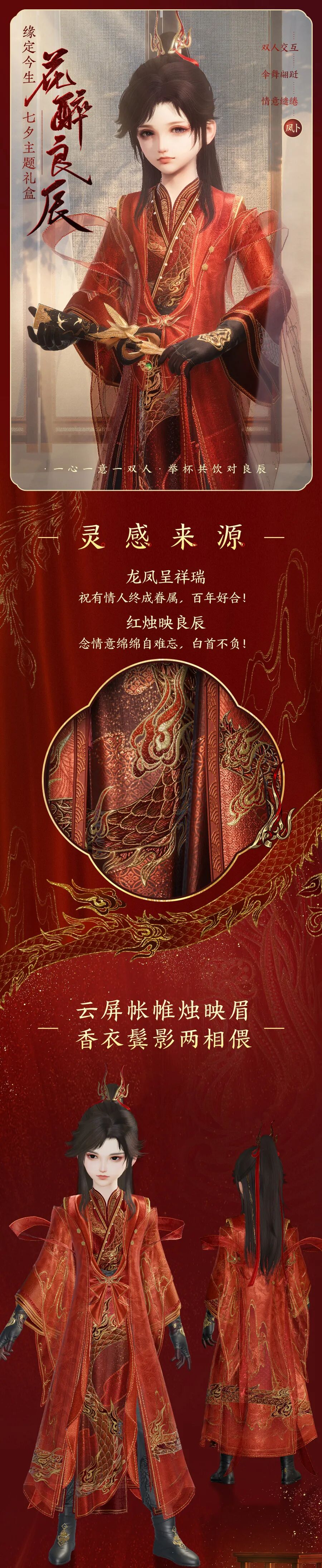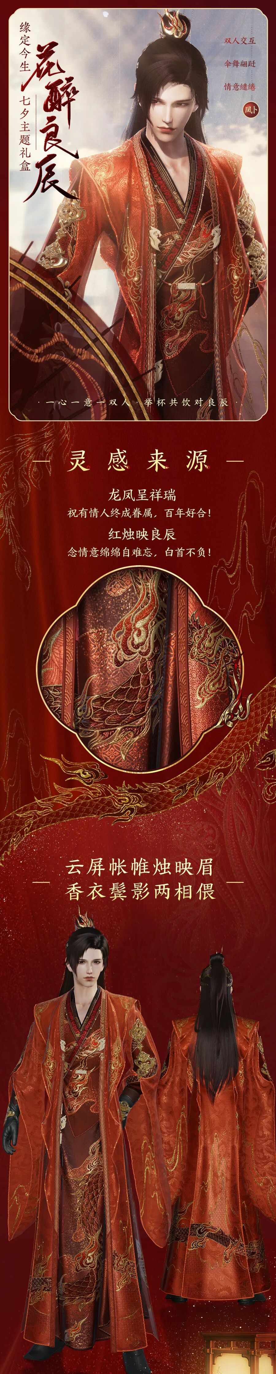 本期外装男款整体以“团龙密云”的绣纹织就,女款则选用经典纹样“凤穿牡丹”,二者共取“龙凤呈祥”的好意兆,以此祝愿天下有情人皆有如龙凤般和鸣铿锵,姻缘久长的美好爱情!