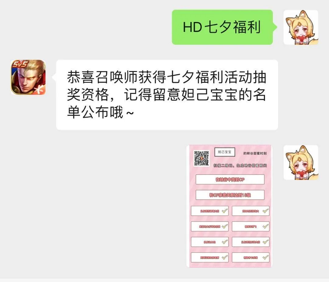 发送【HD七夕福利】到公众号后台,截止8月26日,妲己宝宝将随机抽取7位召唤师,送出永久皮肤*1(阿轲-爱心护理、妲己-女仆咖啡、白起-星夜王子三选一)