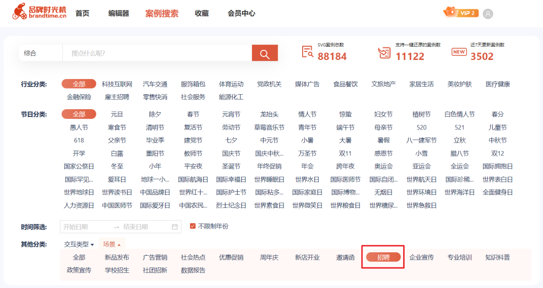 如果以上案例还没有看够,可以到「品牌时光机」交互图文案例库(网址:brandtime.cn)搜索「秋招」关键词或在场景分类里选择「招聘」查看更多案例。