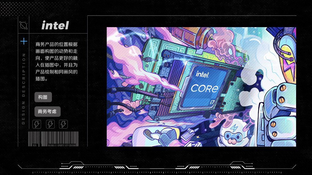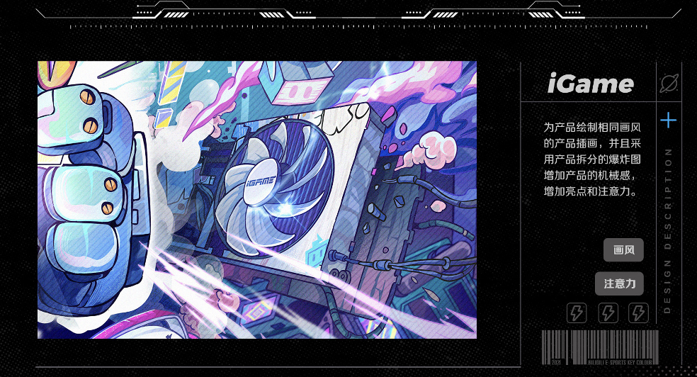 无论是中心化构图突出品牌符号,还是增加画面亮点和电竞冲击感的元素分析、配色选择等都是被卡昂卡昂拆分成环环相扣的环节,共同成就了设计美学和产品信息相平衡的杰作。