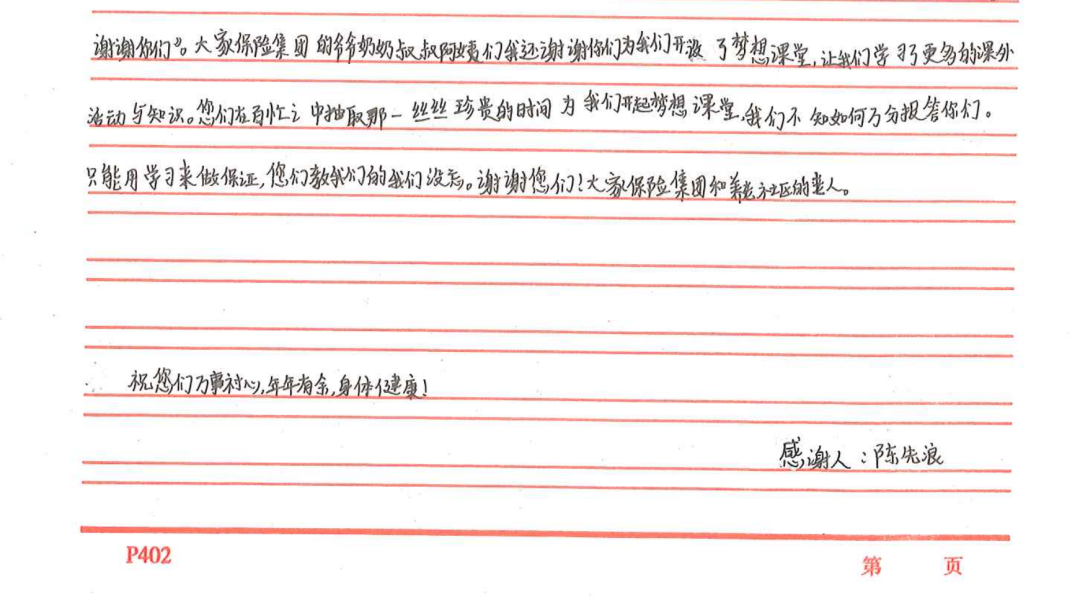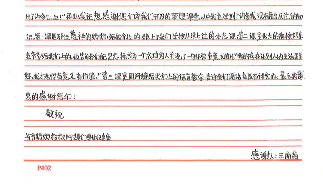 2020年12月,张家口市清三营乡寄宿制小学加入“大家梦想课堂”。养老社区住户张阿姨和志愿者带来人生励志系列课程,经过精心设计的课程内容,通过励志故事鼓励山区孩子们学会“立志”和“励志”,并在立志后能够竭尽全力实现自己的目标,从而成为对国家、人民有贡献的成功人士。