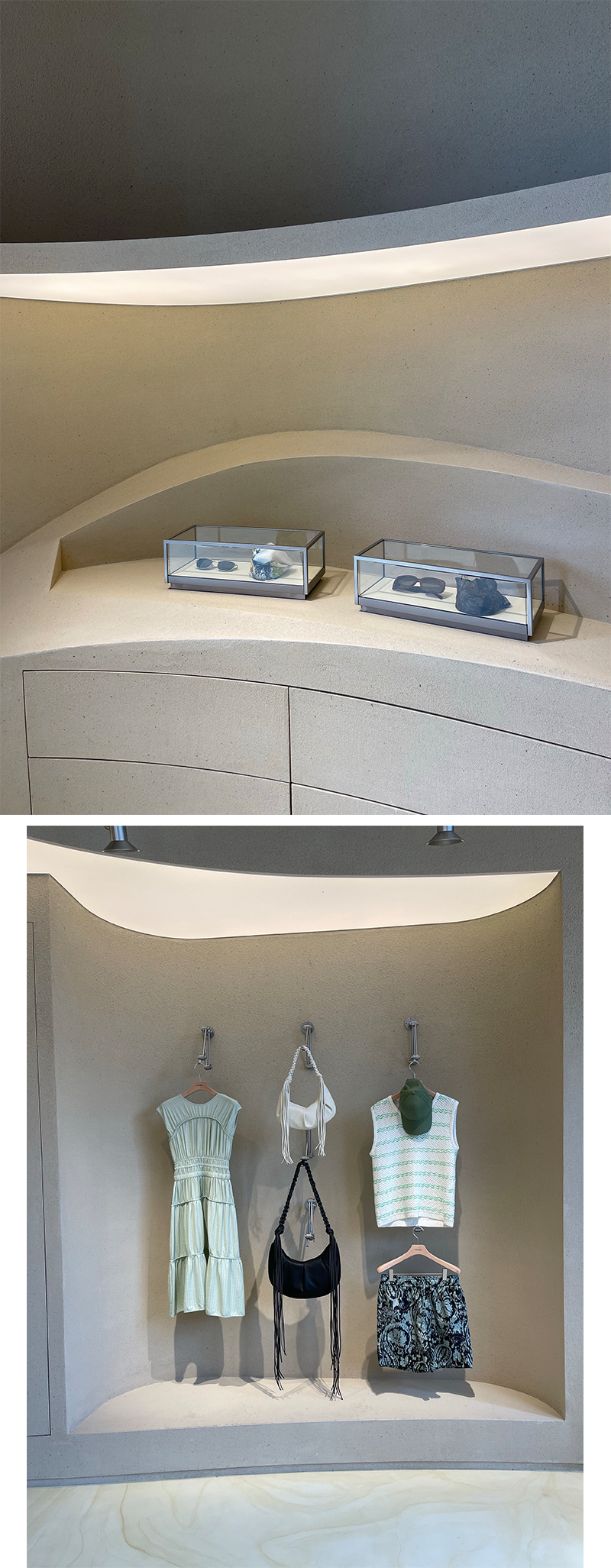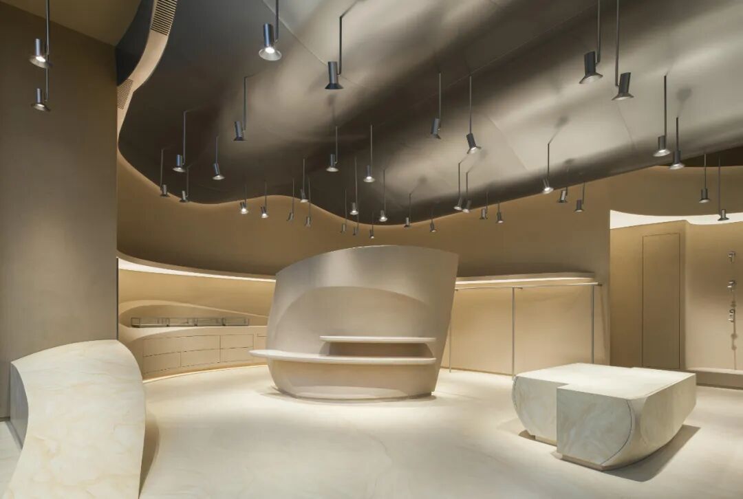 来自Snøhetta事务所的高级室内建筑师Peter Girgis和Manon Tardieu表示,“成都门店设计灵感源自挪威无垠海岸与海面潮汐交相辉映的唯美景象,以骄阳与海流碰撞而成的自然风景为主题。” 贯穿整个空间的波浪与曲线向挪威变幻无穷的岩层和绵延不绝的西海岸线致敬,折射而成的光面引人联想到苍穹与大海。门店采用大量天然材料,造型特异的“液态”压铸玻璃墙构筑店铺外立面,向路人直观展示大地色系的内部空间。店铺入口地板与天花板采用喷砂波浪设计,向内延申至陈列区。装有机械臂的主展示墙聚焦Holzweiler标志性的真丝、羊毛和羊绒围巾,与陈列当季成衣的轨道式衣架相辅相成。店内固定装置可以自由拆卸,便于未来灵活运用与再设计,契合品牌的可持续发展的设计理念。店内收银区将单独设立于陈列区之外,旨在保护顾客隐私。