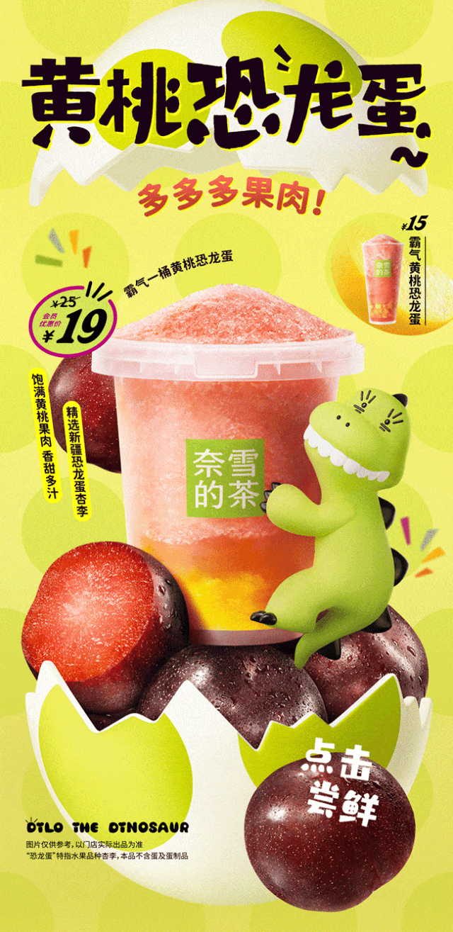 推荐:「点击展开」杏李外号恐龙李制成的饮品介绍,吸引大家购买新品黄桃恐龙蛋果茶、烘焙套餐等。