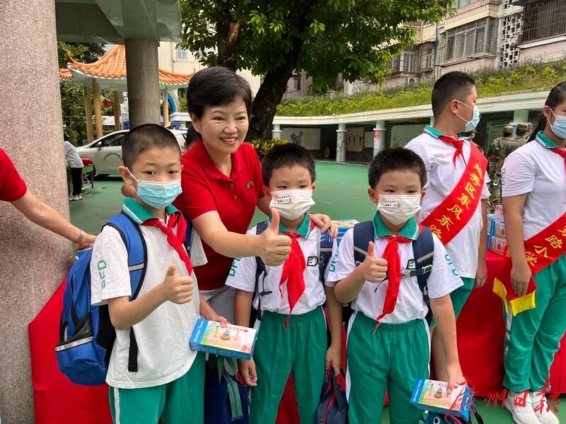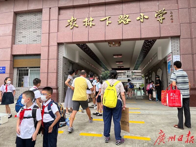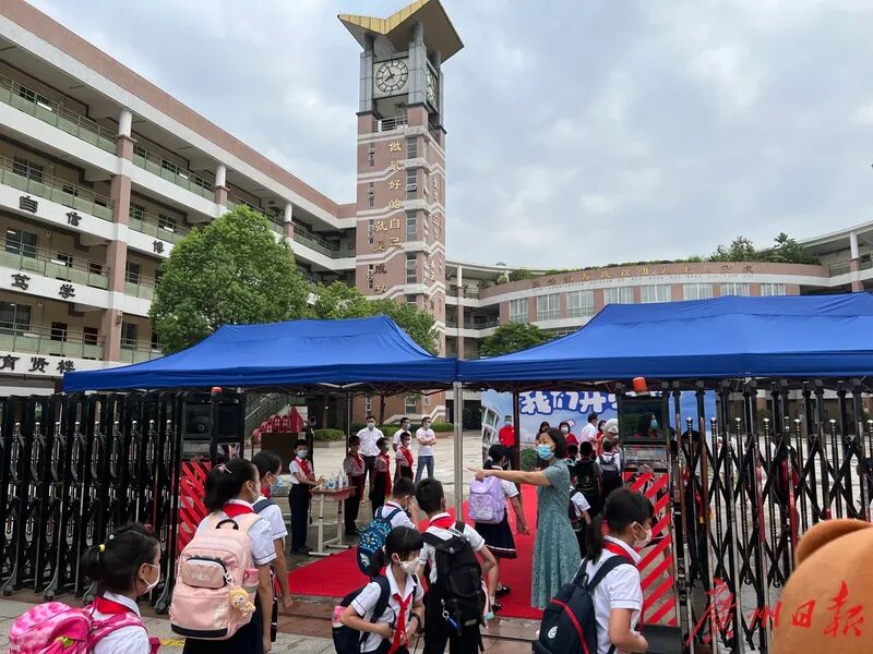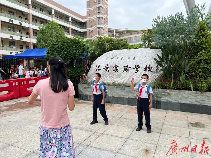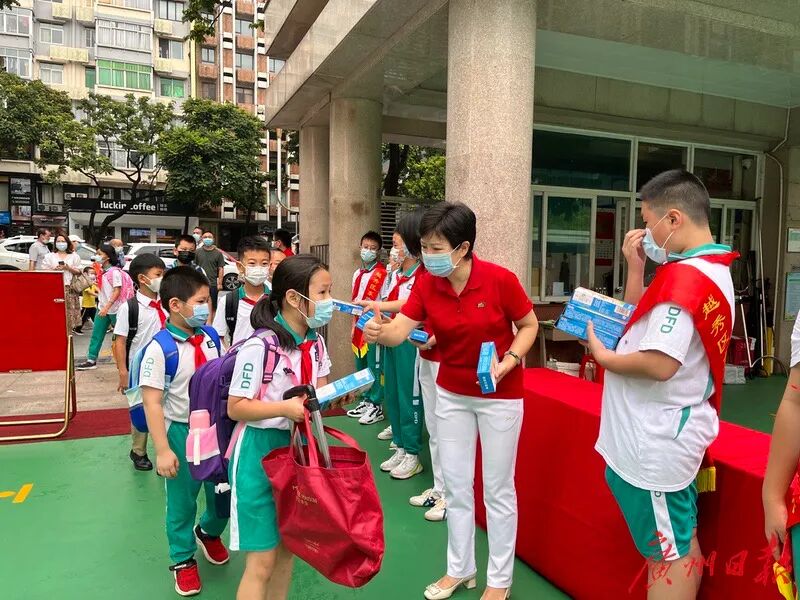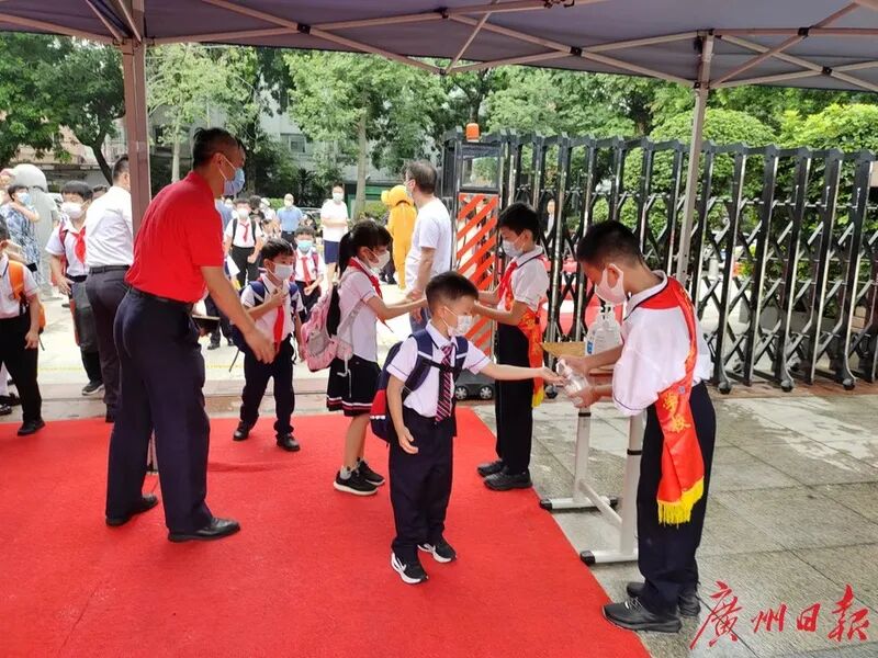 在越秀区东风东路小学校门口,每位回校的同学都从老师手中接过学校准备的开学礼物。