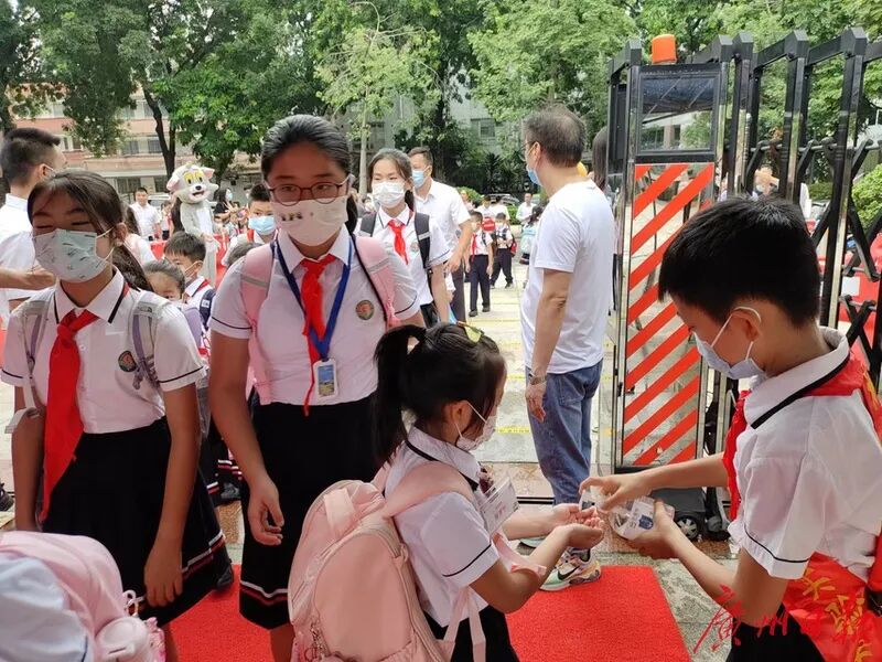 广州市天河区汇景实验学校,有高年级的同学专门为回校的学生进行手部消毒。