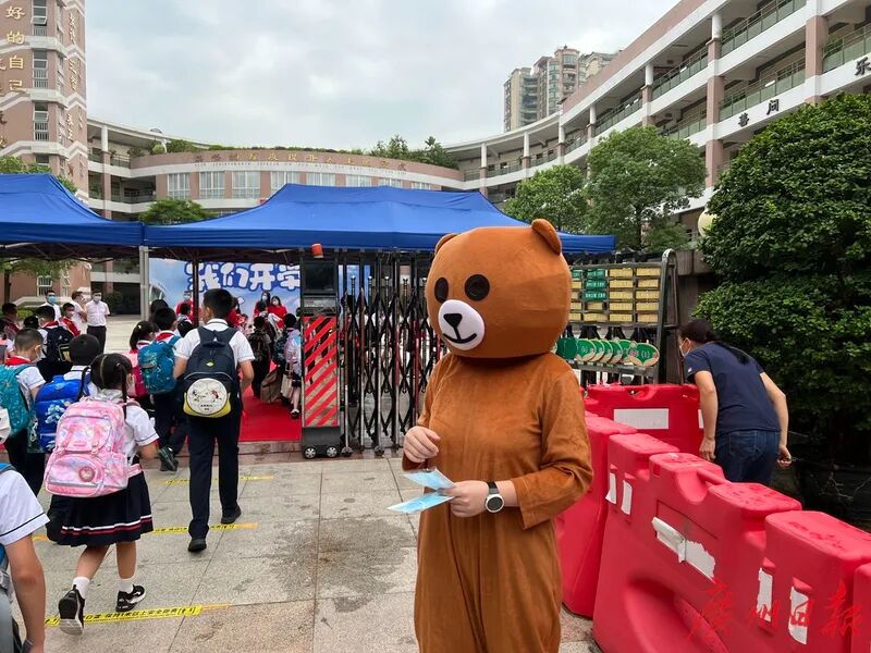早上8点,在广州市天河区汇景实验学校,初二的学生杨同学穿着公仔给小学的同学们发口罩,她说,这样让同学们感觉更亲切。