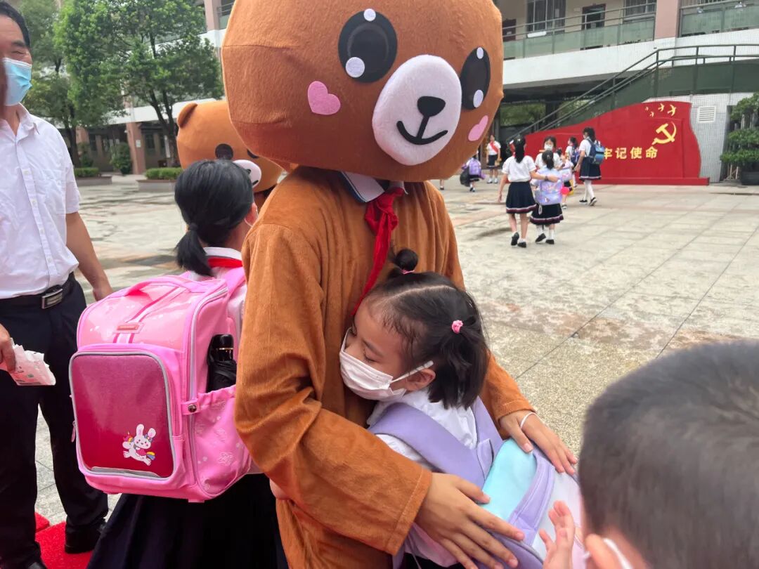 广州市天河区汇景实验学校,小学生回到学校后紧紧抱着初中穿着公仔服的学长学姐,画面颇为温馨。
