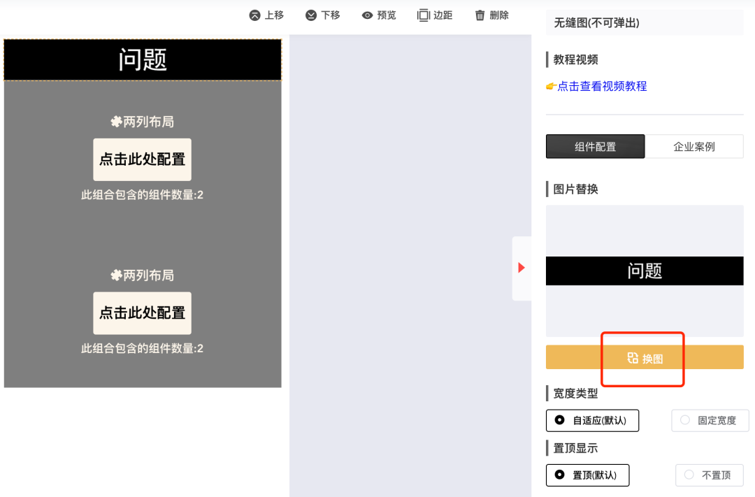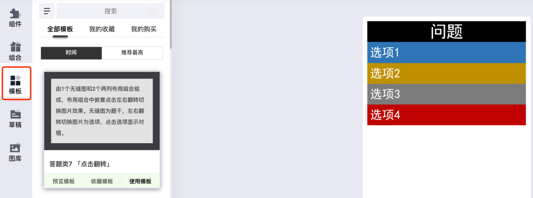这7个答题模板都是由编辑器的多个组件或组合组成,一键点击使用,然后把示例图片替换成自己的图片就可以了。