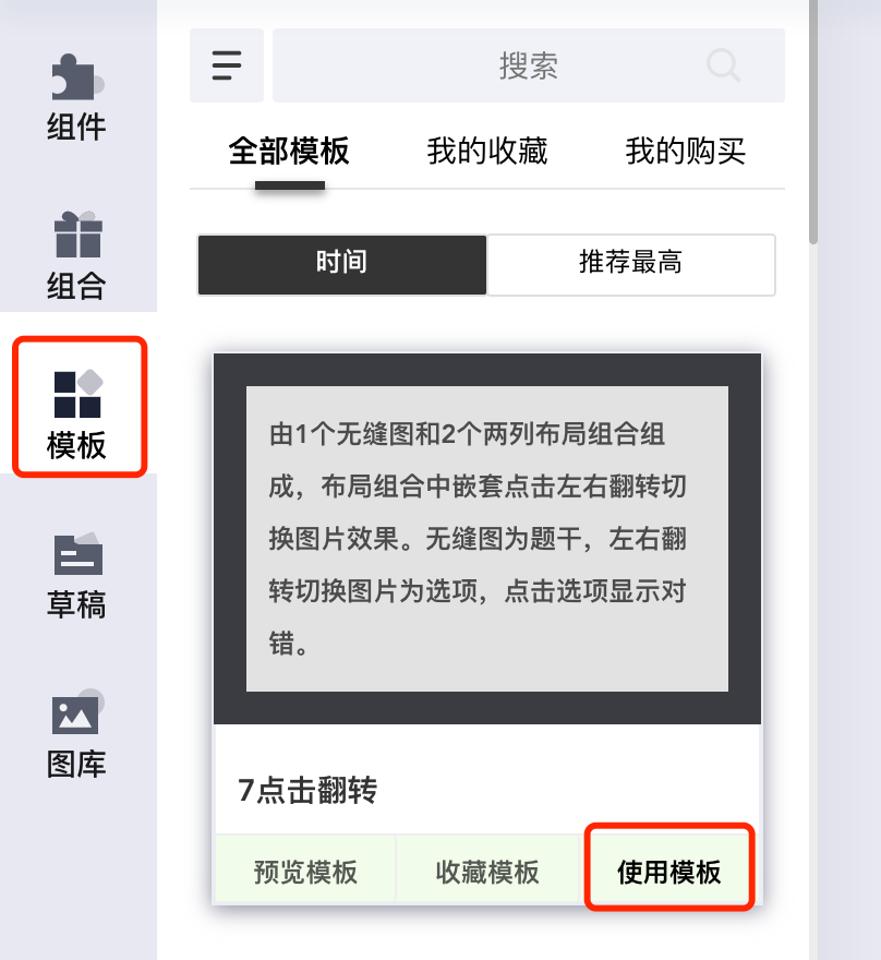 登录 iPaiban Pro 编辑器后,点击编辑器左侧「模板」按钮,找到「点击翻转」答题模板,点击使用。