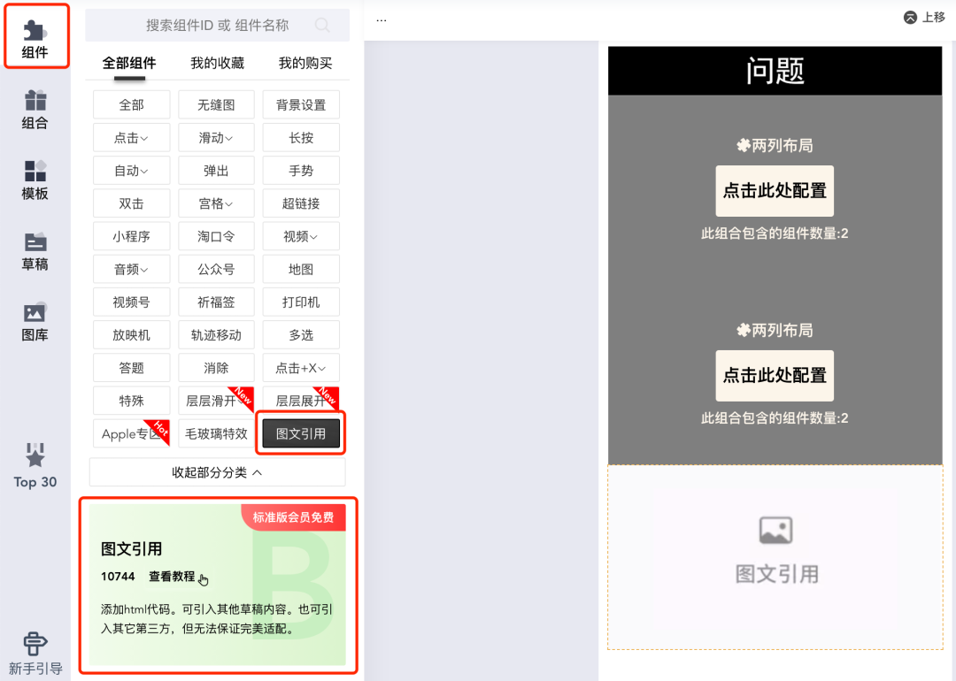 点击右侧「导入微信后台」复制生成的代码,接着回到第1个问题的草稿,在左侧「组件」-「图文引用」中选择「图文引用」组件,然后将代码粘贴在右侧输入框中,这样我们就设置了两个问题。