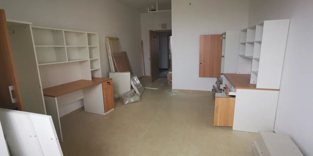 目前七、八号宿舍楼内、外墙已粉刷完毕,宿舍楼南侧土方已清理,部分家具已组装,洗衣机等设备逐步安装中。