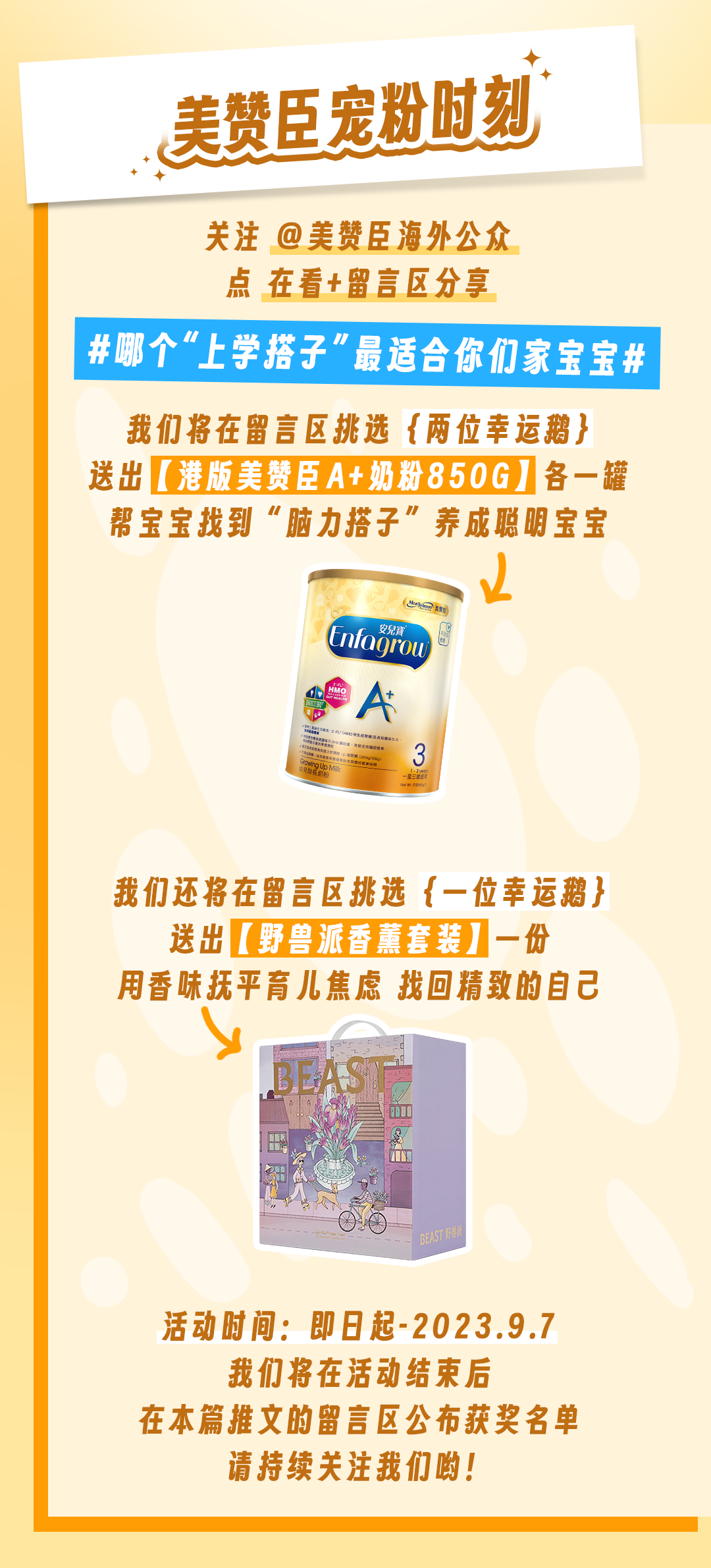 6、奖品种类:奖品数量共3份,包含【港版美赞臣A+850g】2份,【野兽派香薰套装】1份