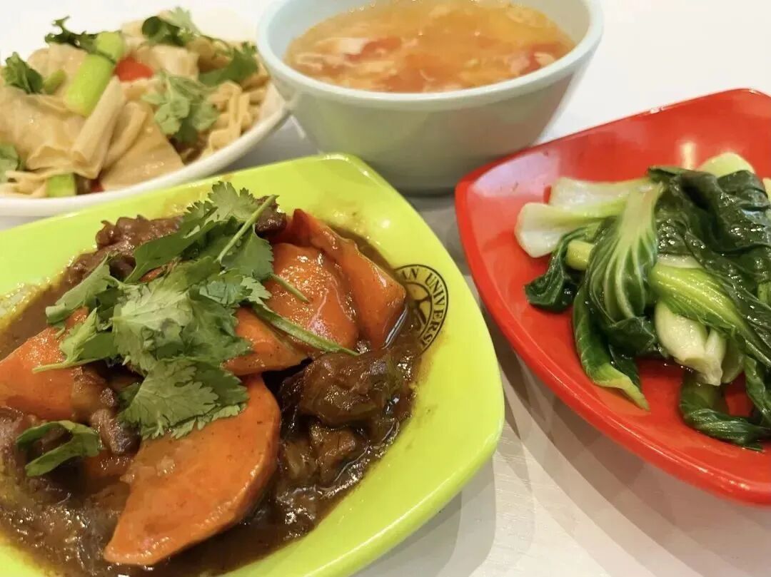 套餐一(10.1元/份):胡萝卜红烧羊肉、炒油豆皮、西红柿鸡蛋汤、时蔬