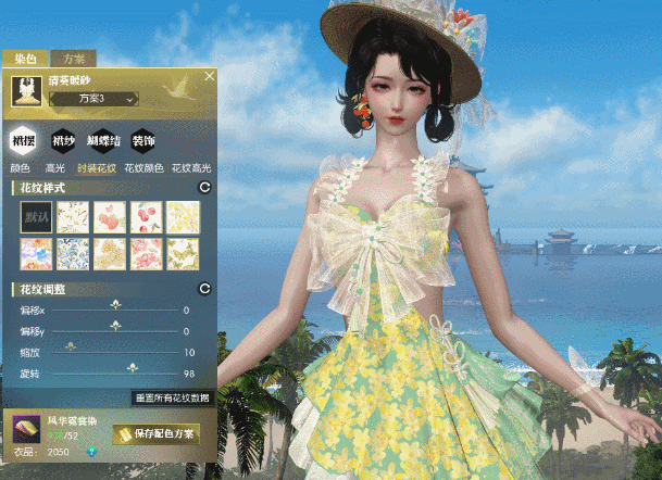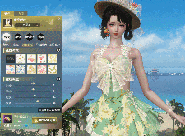 1)时装染色支持更换时装花纹,除了基础的可更改花纹颜色和高光外,更换的时装花纹更可自由调节花纹的大小、旋转与偏移。