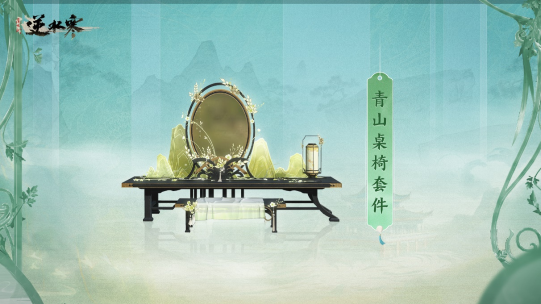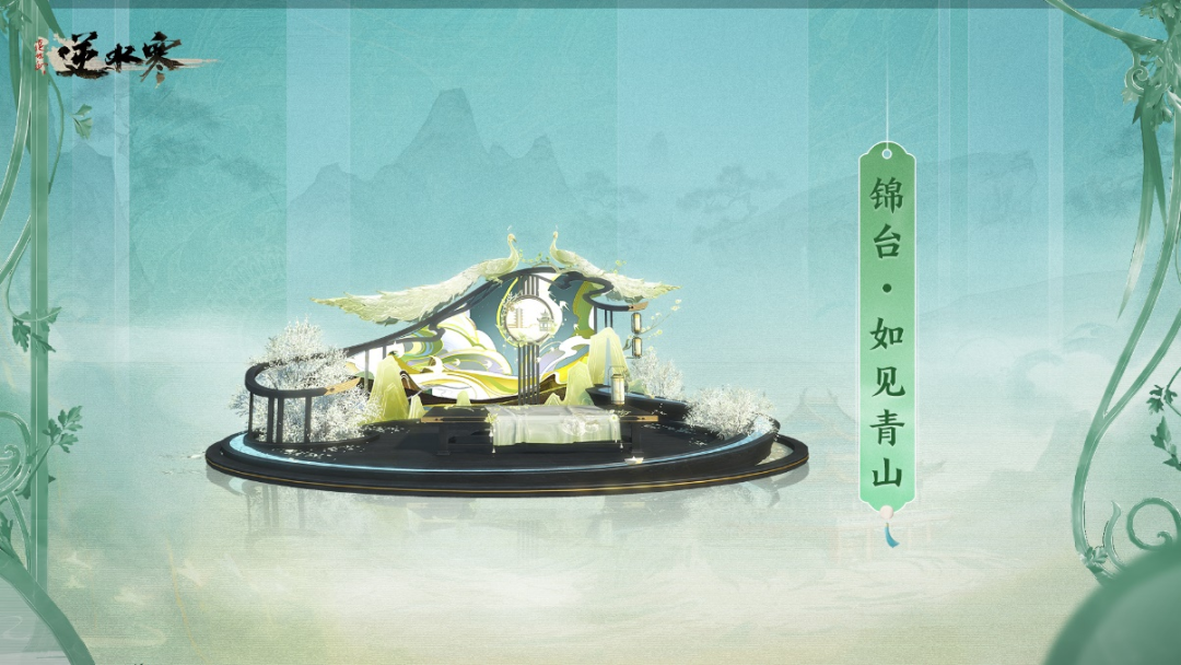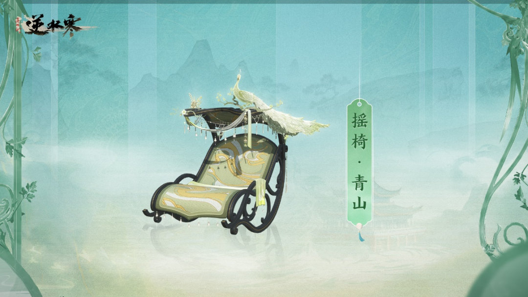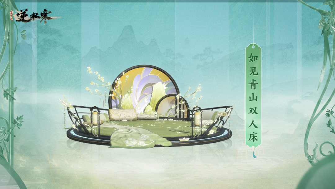 庄园新增青山系列组件【锦台·如见青山】【如见青山双人床】【青山桌椅套件】【摇椅·青山】,可花费元宝购买。