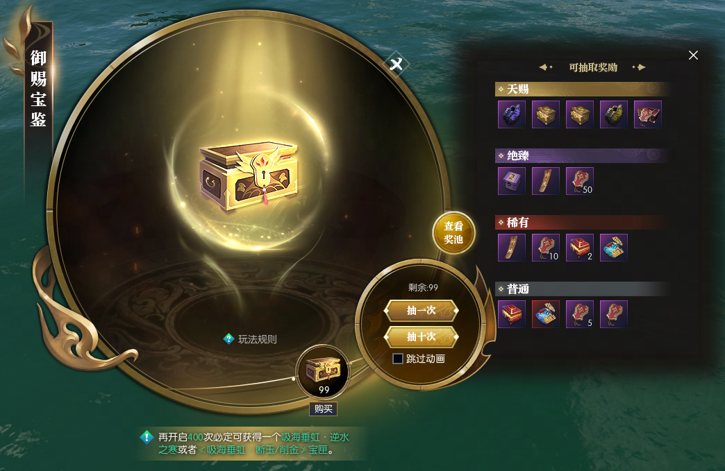 【御赐宝鉴兑换券】可用于兑换【御赐装备匣】,开启可随机获得交子、百炼令、紫装、纳地/承天玉笏、百炼神兵箱、稀有词条等奖励,且累计开启不超过400次,必定可获得一个【吸海垂虹·逆水之寒】或【吸海垂虹·断玉/削金】。