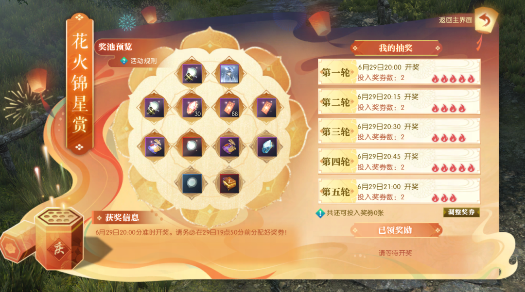 a)6月22日更新后-6月29日19:50期间,登录游戏将自动获得10张抽奖券 ,可在【京华不夜天】活动界面的【花火锦星赏 】页面分配奖券到5轮抽奖的奖池中。