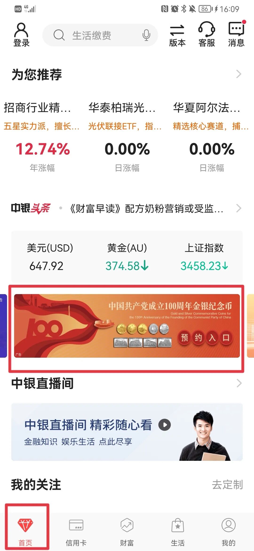 登录中国银行APP,进入 “首页” ,下滑至 “轮播广告” 点击进入即可预约。