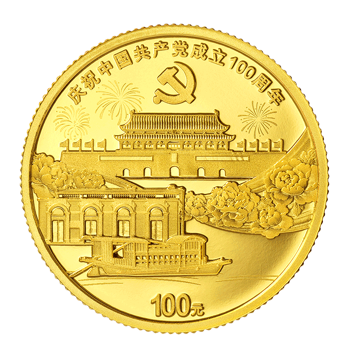 8克圆形金质纪念币背面图案为党徽、上海中共一大会址、浙江嘉兴南湖红船、天安门、礼花、牡丹花、飘带等组合设计,并刊“庆祝中国共产党成立100周年”字样及面额。