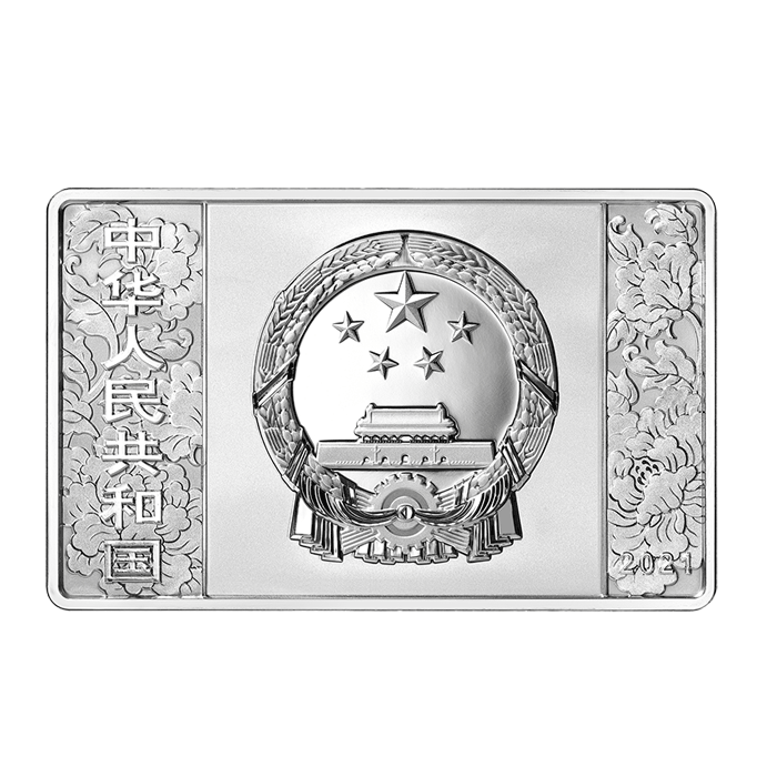 30克圆形银质纪念币正面图案为中华人民共和国国徽辅以牡丹花组合设计,并刊国名、年号。