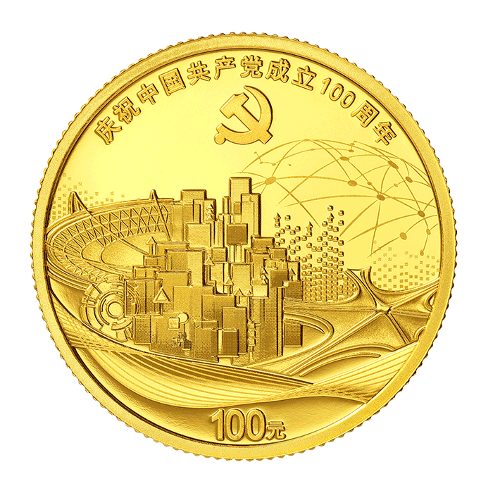 8克圆形金质纪念币背面图案为党徽、城市建筑、高铁、绿水青山、美丽乡村、拓荒牛、飘带等组合设计,并刊“庆祝中国共产党成立100周年”字样及面额。