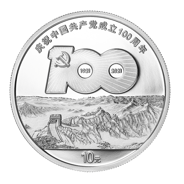 30克圆形银质纪念币背面图案为中国共产党成立100周年庆祝活动标识,辅以《长城颂》漆壁画组合设计,并刊“庆祝中国共产党成立100周年”字样及面额。