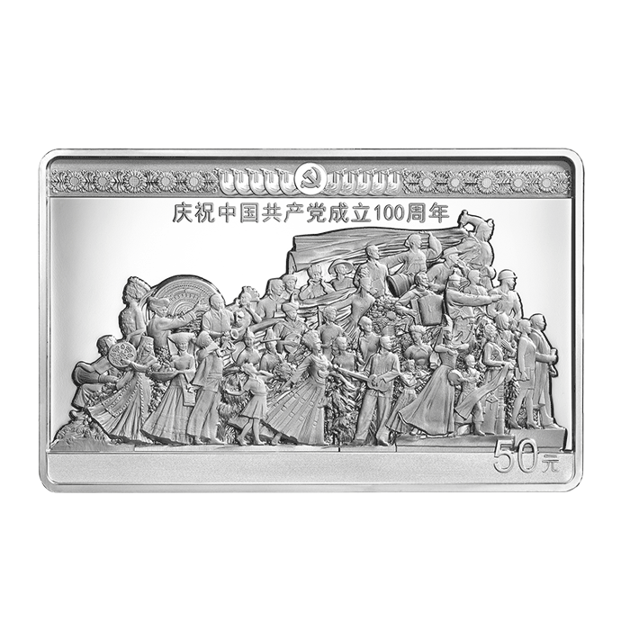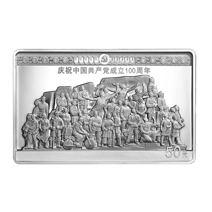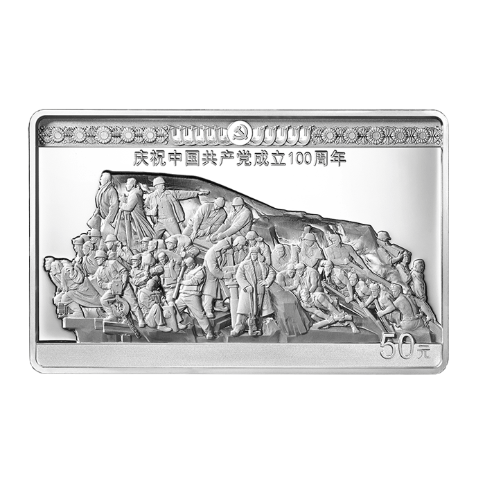 150克长方形银质纪念币背面图案为《攻坚》雕塑局部造型,辅以中国共产党历史展览馆馆徽等组合设计,并刊“庆祝中国共产党成立100周年”字样及面额。