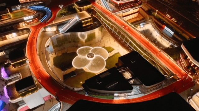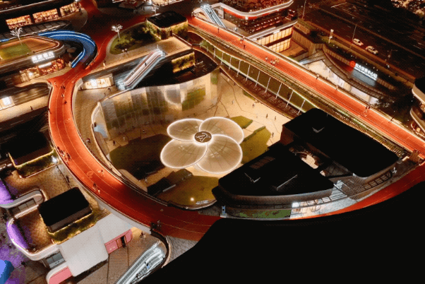 前滩太古里中央公园的东大台阶华丽变身,在炫彩灯光中点亮夜色。