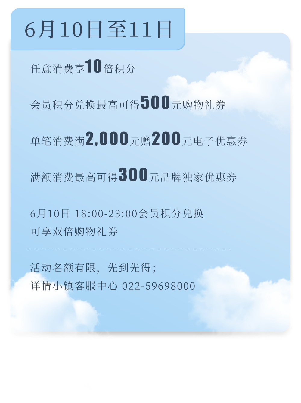 京津佛罗伦萨小镇为大家准备的六月惊喜当然不止“亿”点点,6月10日至6月11日,单笔消费满2000元即赠200元电子券,更有会员专享积分兑换礼券等精彩福利上线!