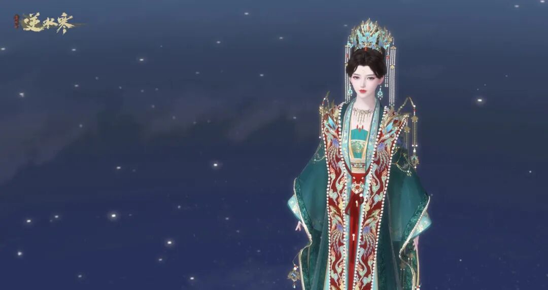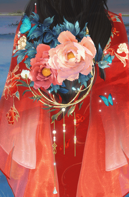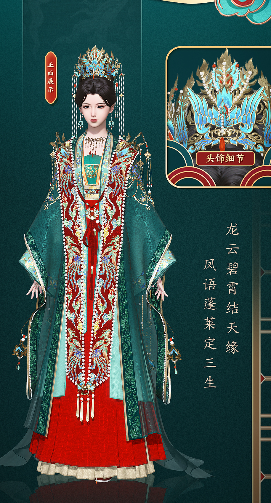 头顶凤冠,碧凤朱玉,熠熠生辉。再配以肩袖挂饰,珠玉摇摇,零叮作响。