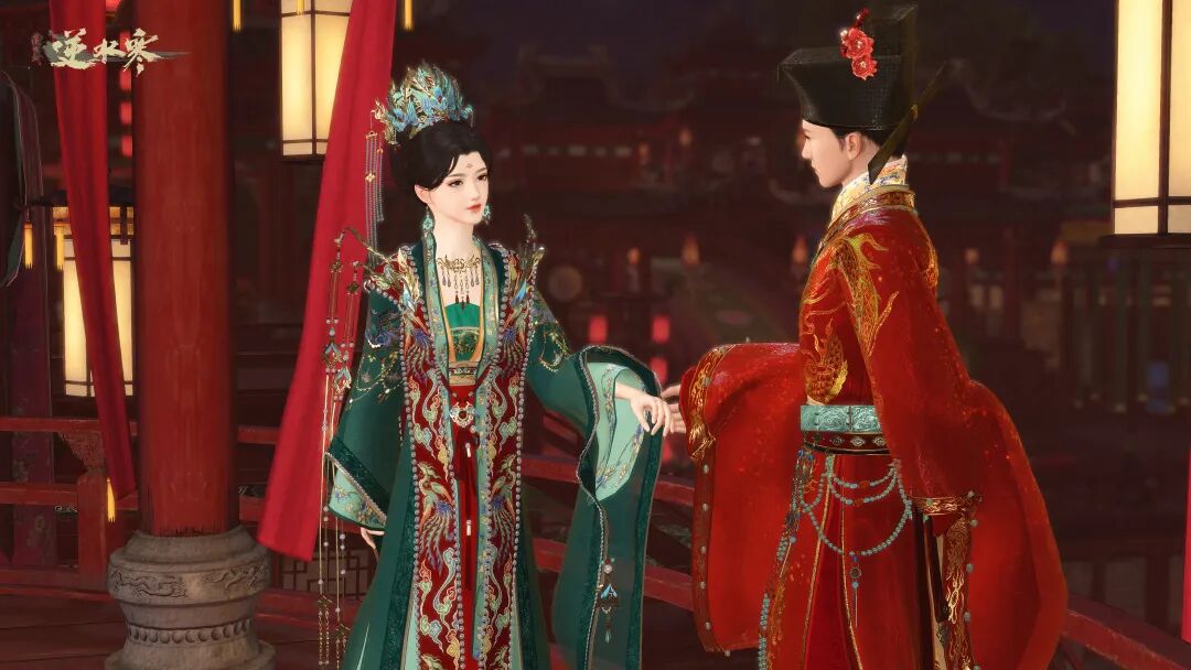 新娘头戴凤冠,身披霞帔,绿色婚服大气雅致。新郎则身着红衣,风姿秀拔。