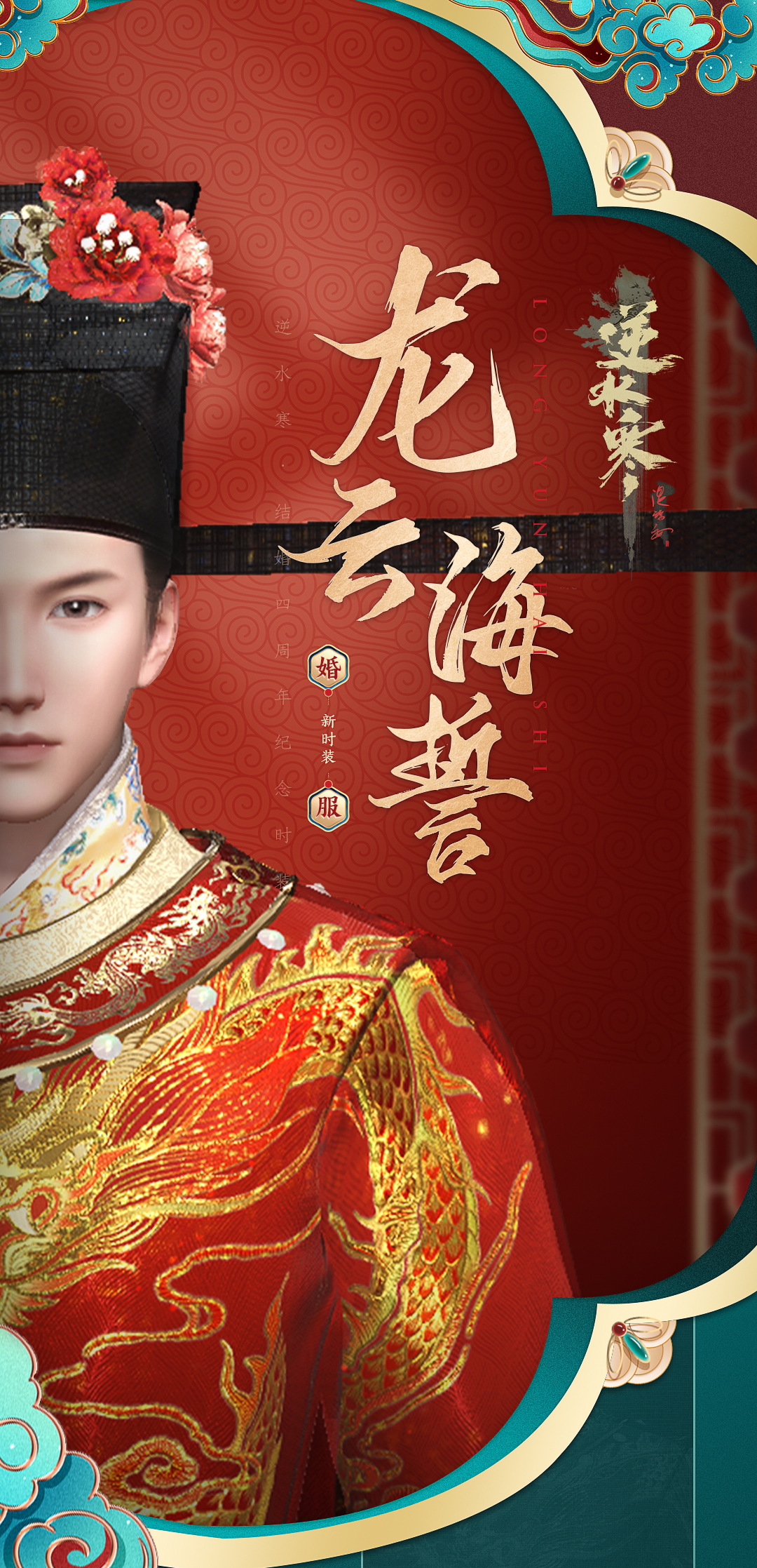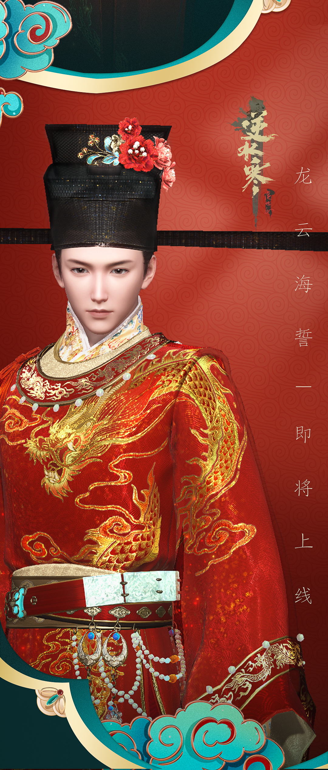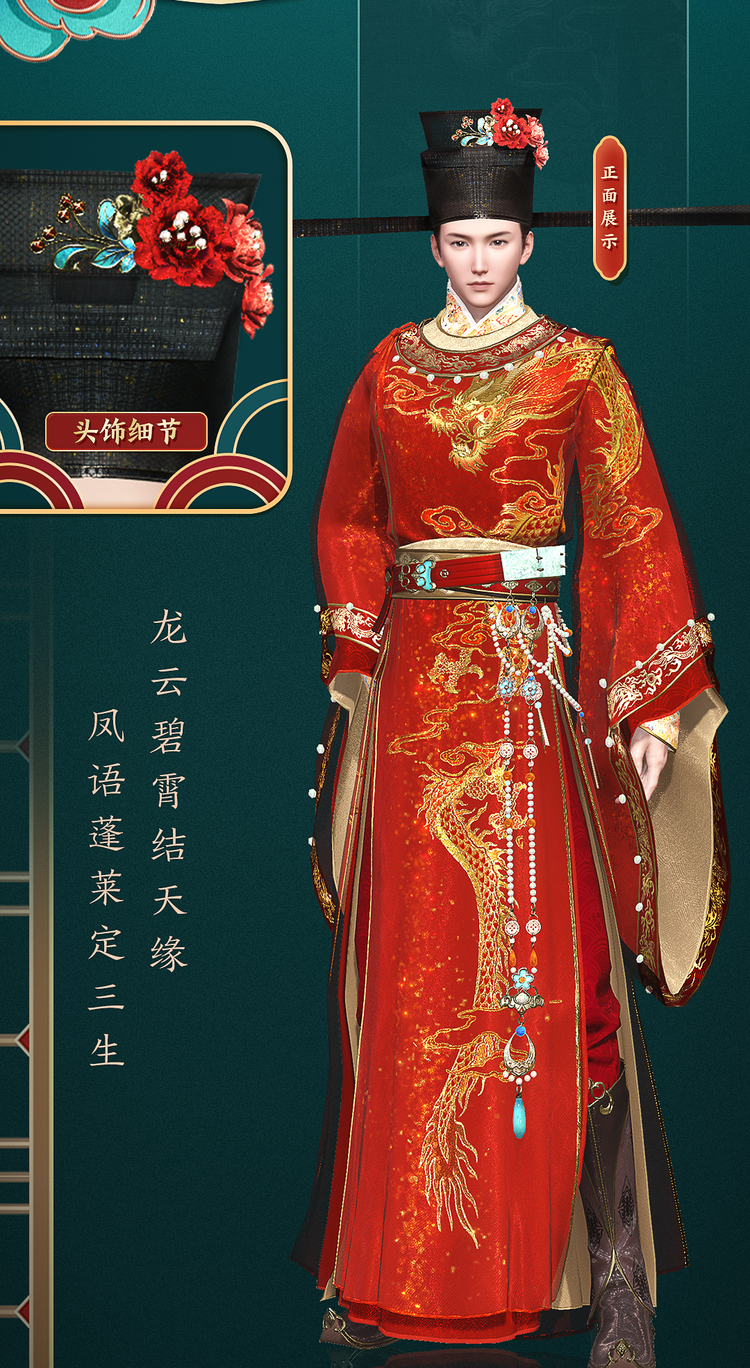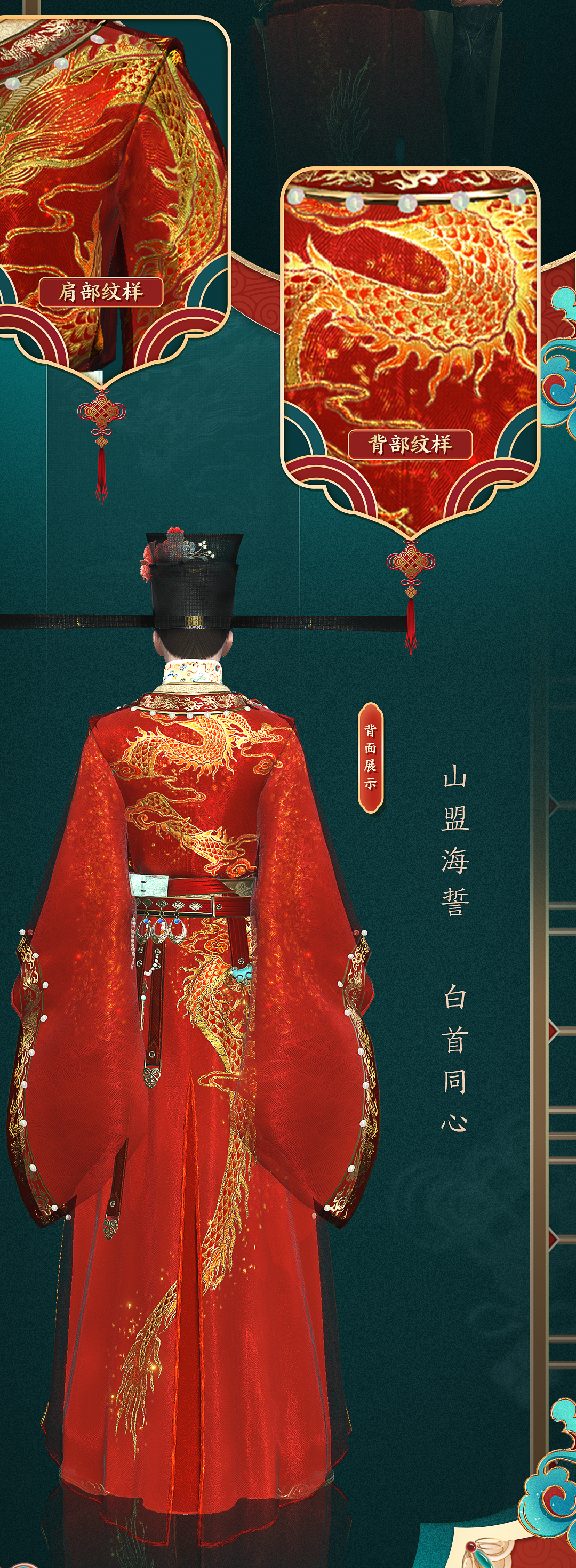 男款婚服【龙云海誓】使用宋代形制,以红色为主色调的衣服大气典雅,金色龙纹盘居衣间,低调华贵。