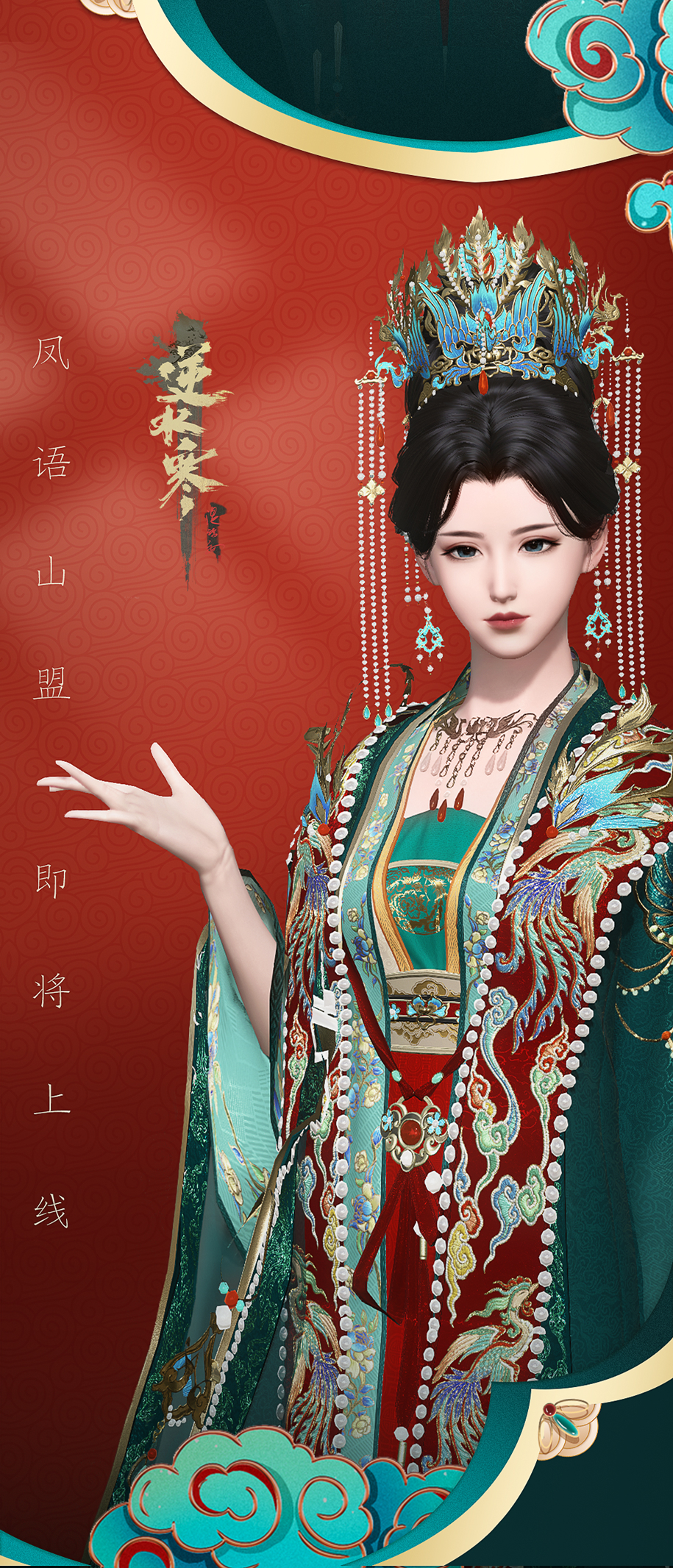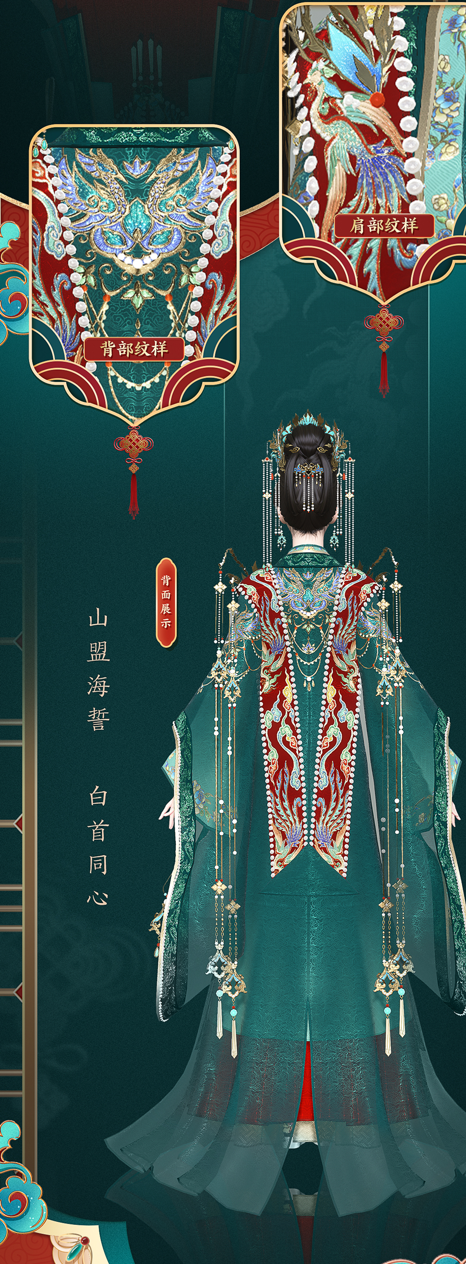 女款时装【凤语山盟】使用了宋代形制的红绿撞色,大气而不沉闷。深红霞帔点缀祥云凤鸟,衫上暗色纹路更显低调华贵。