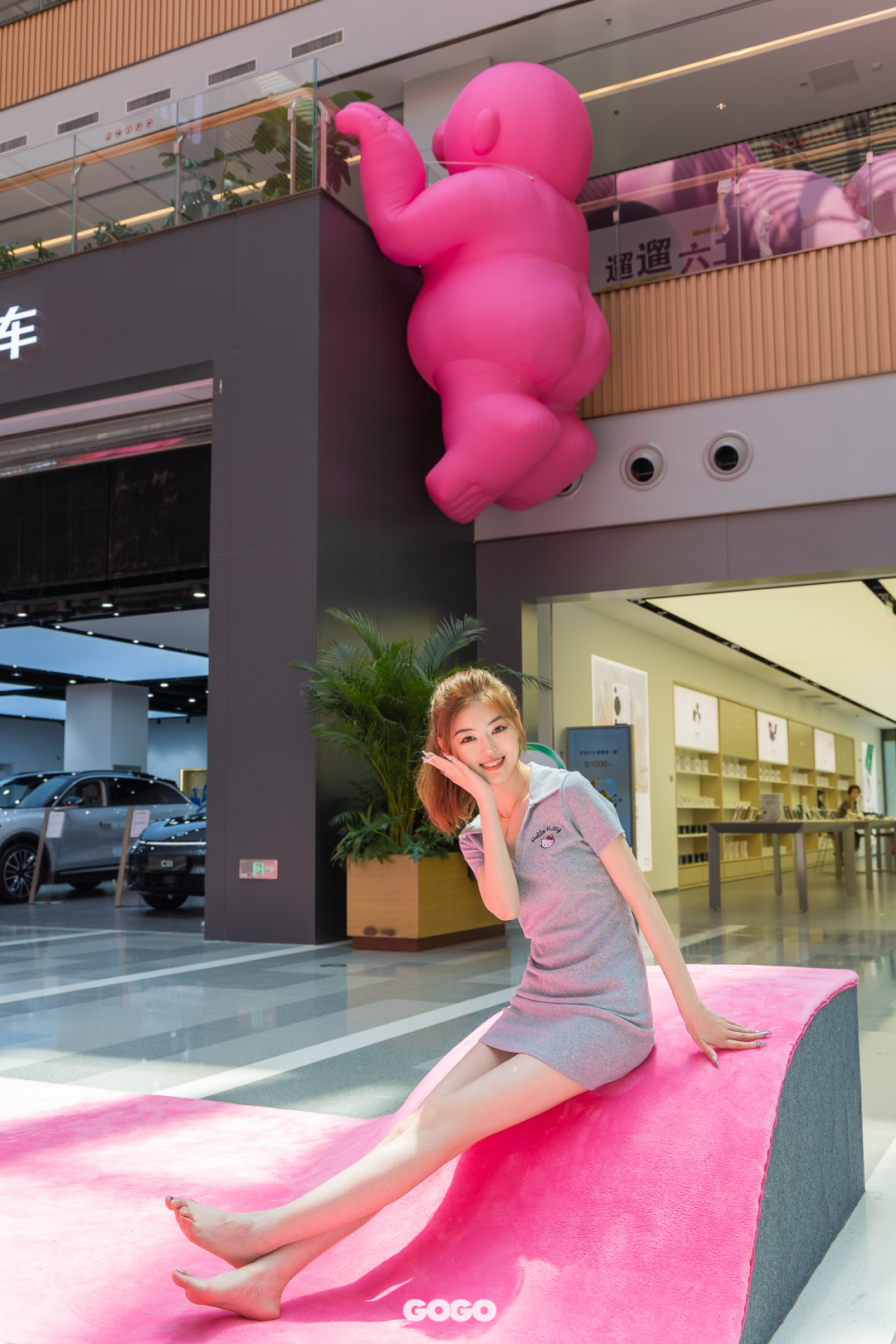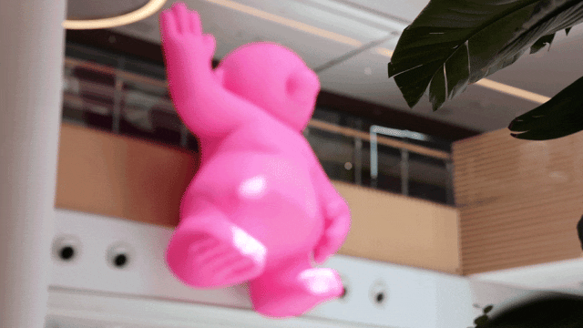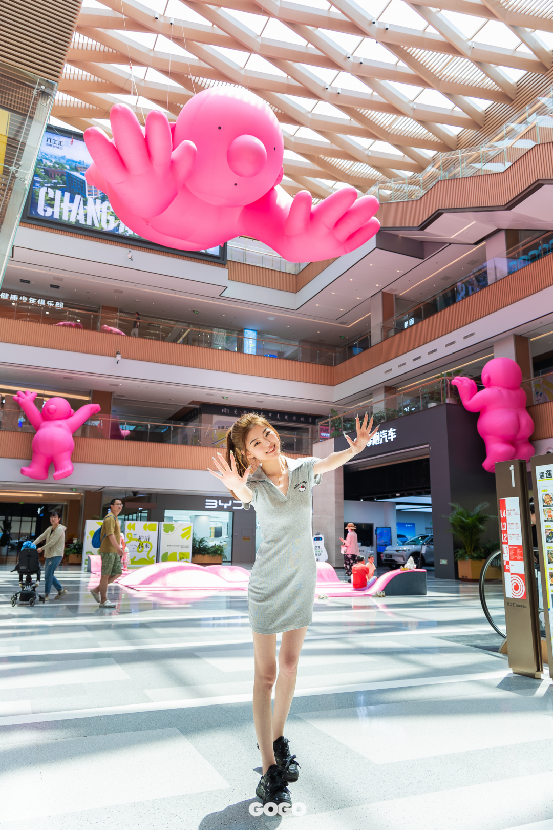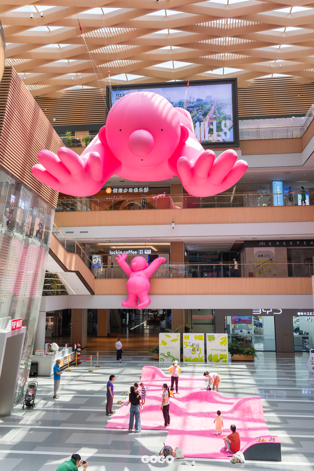 抬头发现中庭上方悬挂着一个长约12米的粉红先生,他张开双臂似乎想要把可爱的你拥入怀中。