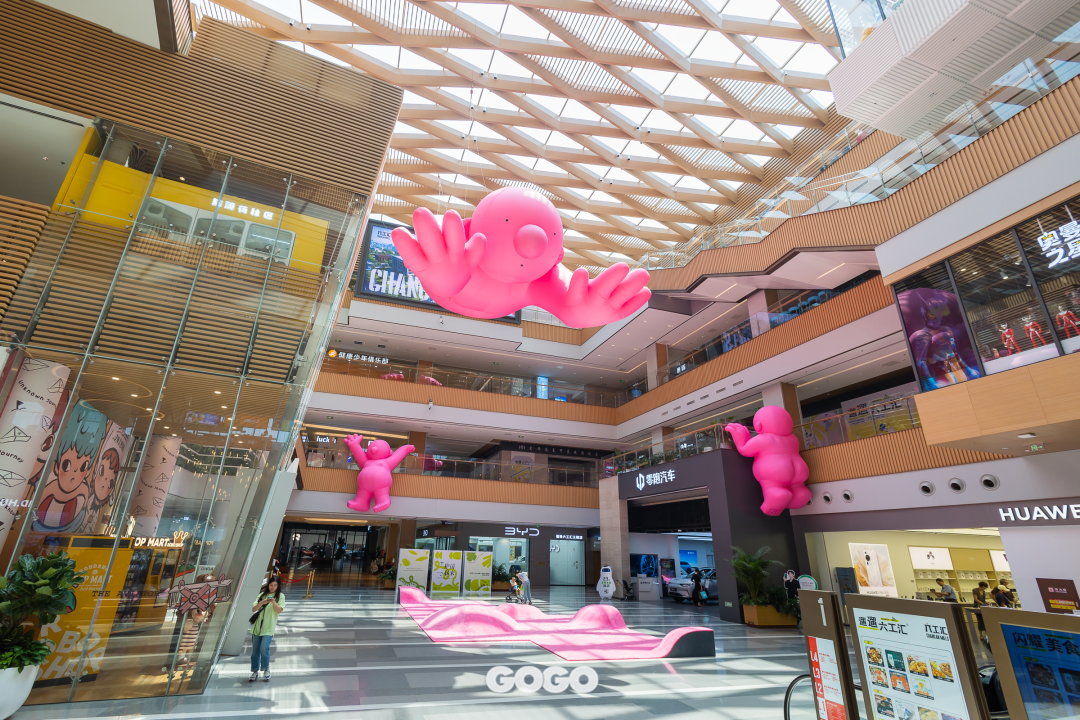 走进六工汇,随处可见的粉色元素直击少女心。中庭悬挂着粉红先生的个展海报,让商场“艺”彩纷呈。