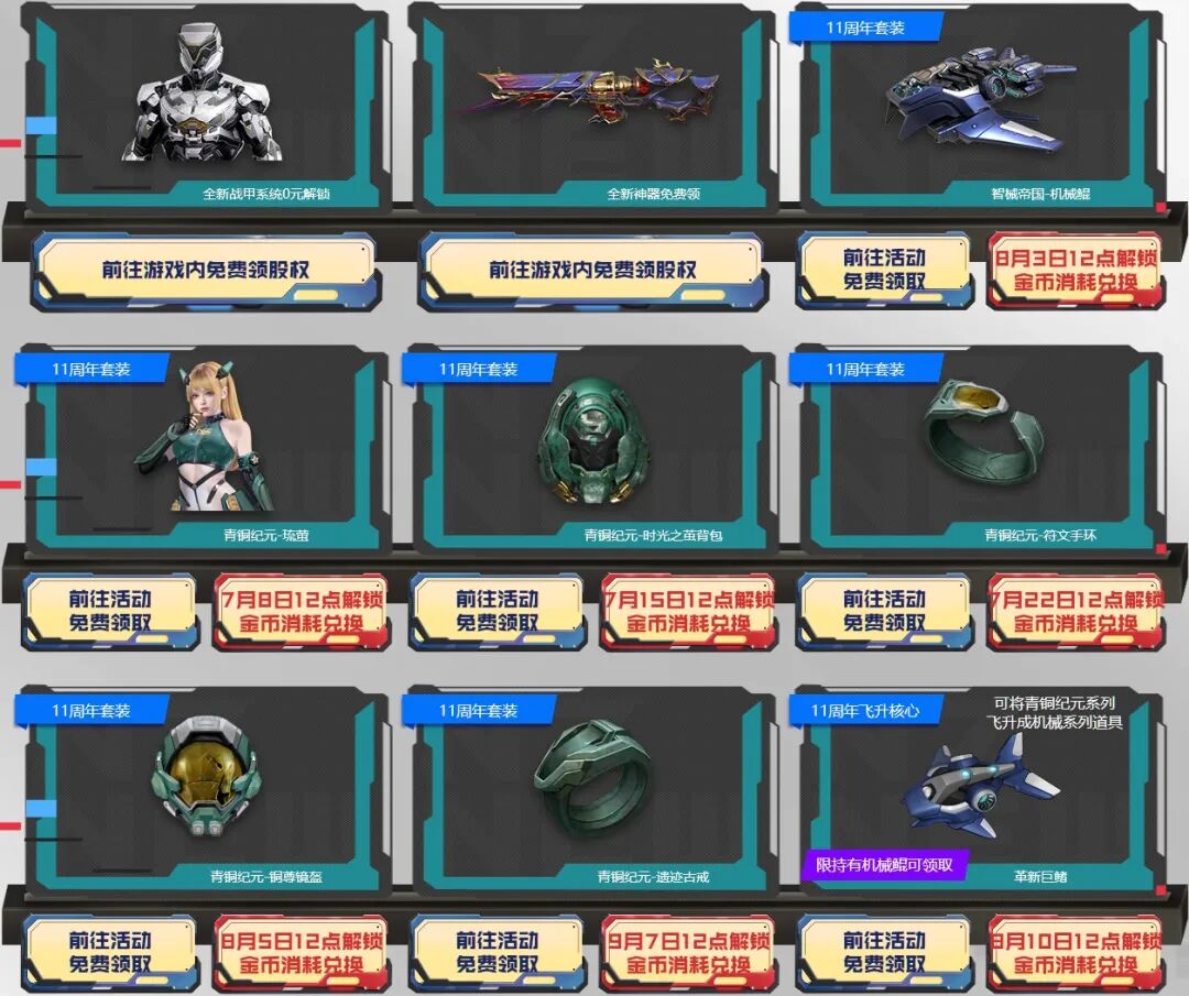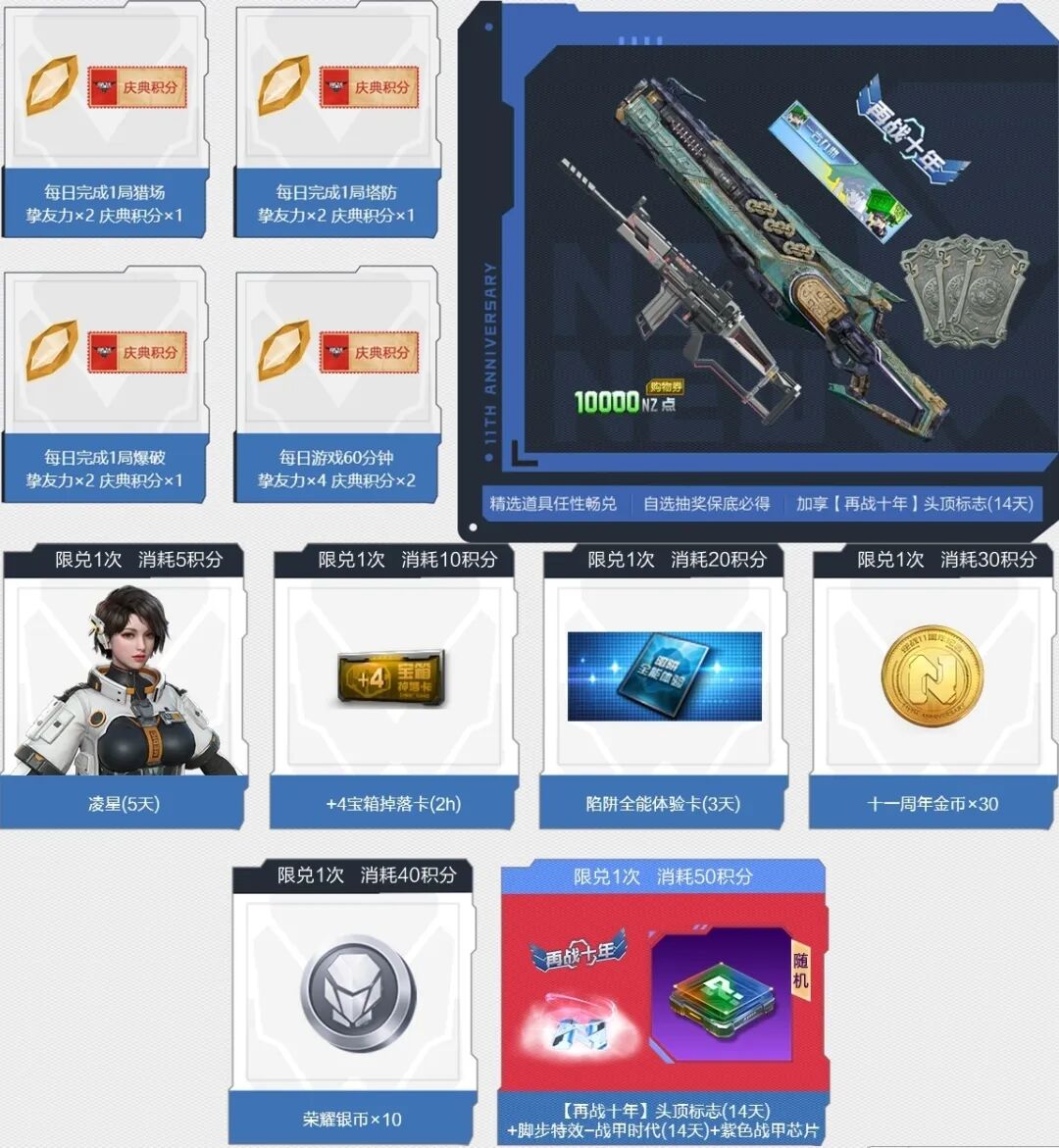 11周年最强福利套装也可以参与活动领取。各位玩家可通过消耗11周年金币,在周年金币兑换商城、周年猎场期限战备商城、周年塔防&PVP期限战备商城中兑换道具。