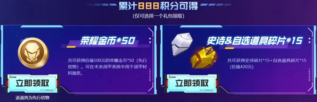 累计888积分,可在价值500元的荣耀金币*50(先行信物),或者在价值420元史诗碎片*15+自选道具碎片*15中任选一个礼包,荣耀金币可在未来战甲系统中用于战甲材料抽奖。