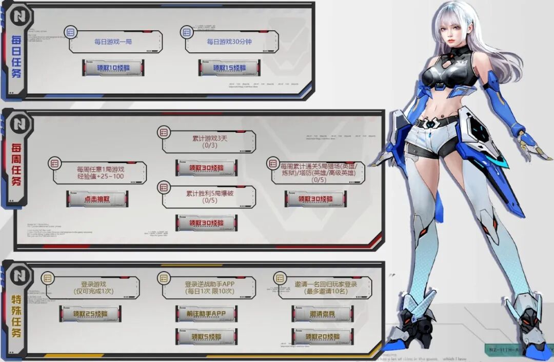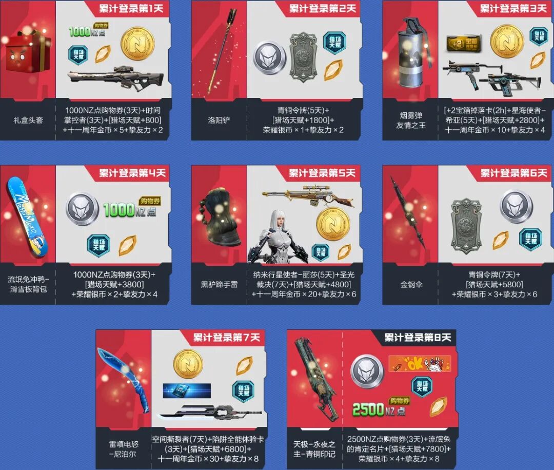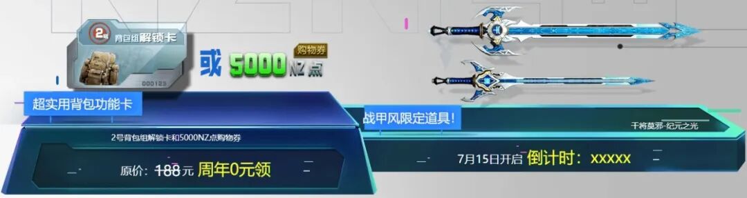累计游戏5天,可以0元领取价值188元的2号背包组解锁卡或5000NZ点购物券(3天);7月15日后,累计游戏天数,还可以领取战甲风限定道具干将莫邪-纪元之光。