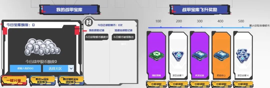 暑期战甲免费养成也将限时开启,各位玩家可以使用荣耀银币养成战甲!各位玩家累计获得100-500荣耀银币时,分别可领取刚能强魄、凌空战魂*1、疾速武装、聚能核心、凌空战魂*4等战甲养成道具,千万别错过。