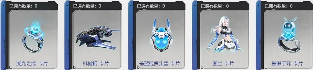 通过抽取卡片,各位玩家可以收集到:溯光之戒-卡片、机械鲲-卡片、苍蓝视界头盔-卡片、图兰-卡片、影锻手环-卡片,以及万能卡、沾沾卡。
