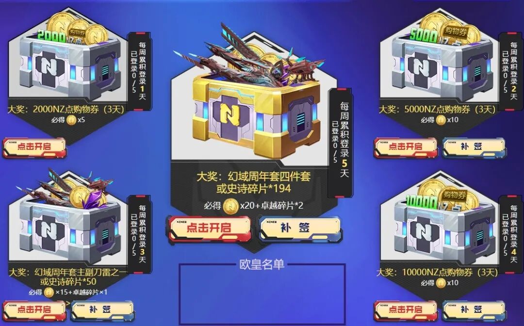 宝箱每周最多开启5次,每周一0点自动重置宝箱,每次保底必得11周年金币,最高可获得幻域周年套四件套或194史诗碎片,当日游戏30分钟,可获得1次补签机会,每周最多补签2次。